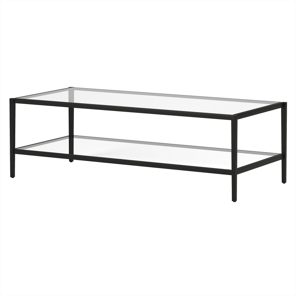 Stylish and super sturdy, the 54-inch black glass and steel coffee table with shelf is an amazingly good looking coffee table that will compliment your living room. A black coloration runs throughout this good looking steel and glass table. Help to keep your space organized with the included single shelf. This classic rectangular table will be a great accent in any room if you're looking for something that can fit into a living area, bedroom, or office, this coffee table is for you. This coffee table is the sturdy, reliable and stylish answer to your living room needs. 17-inch H x 54-inch W x 24-inch D