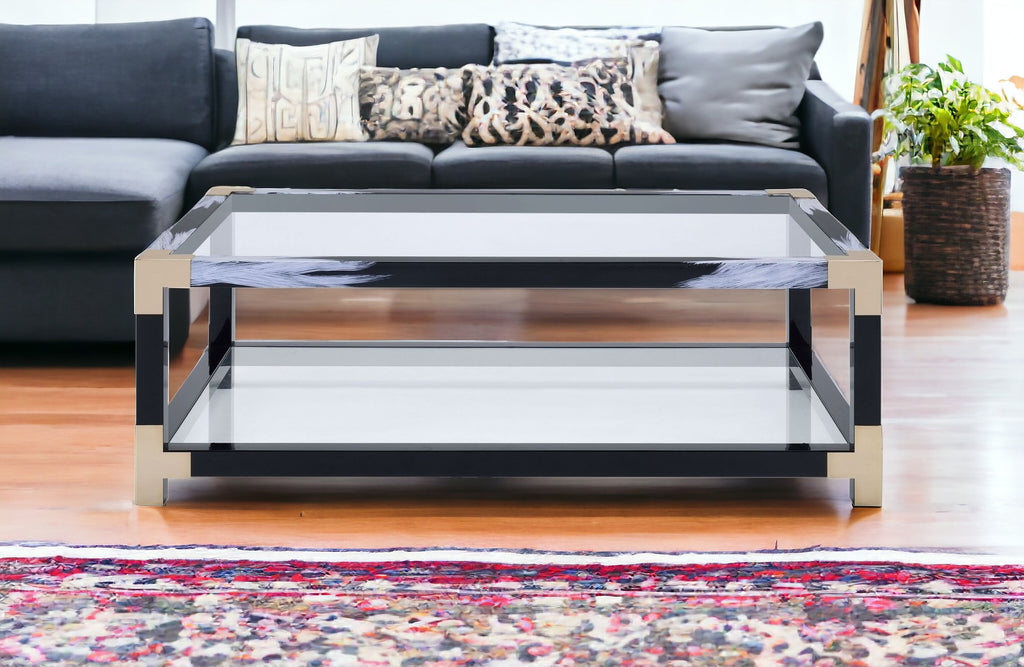 54" Clear And Black and Gold Glass And Iron Coffee Table With Shelf