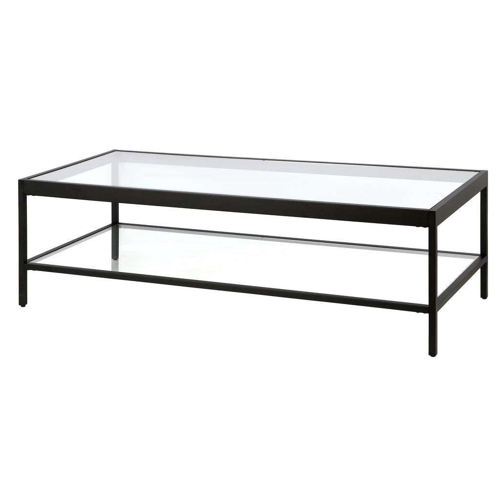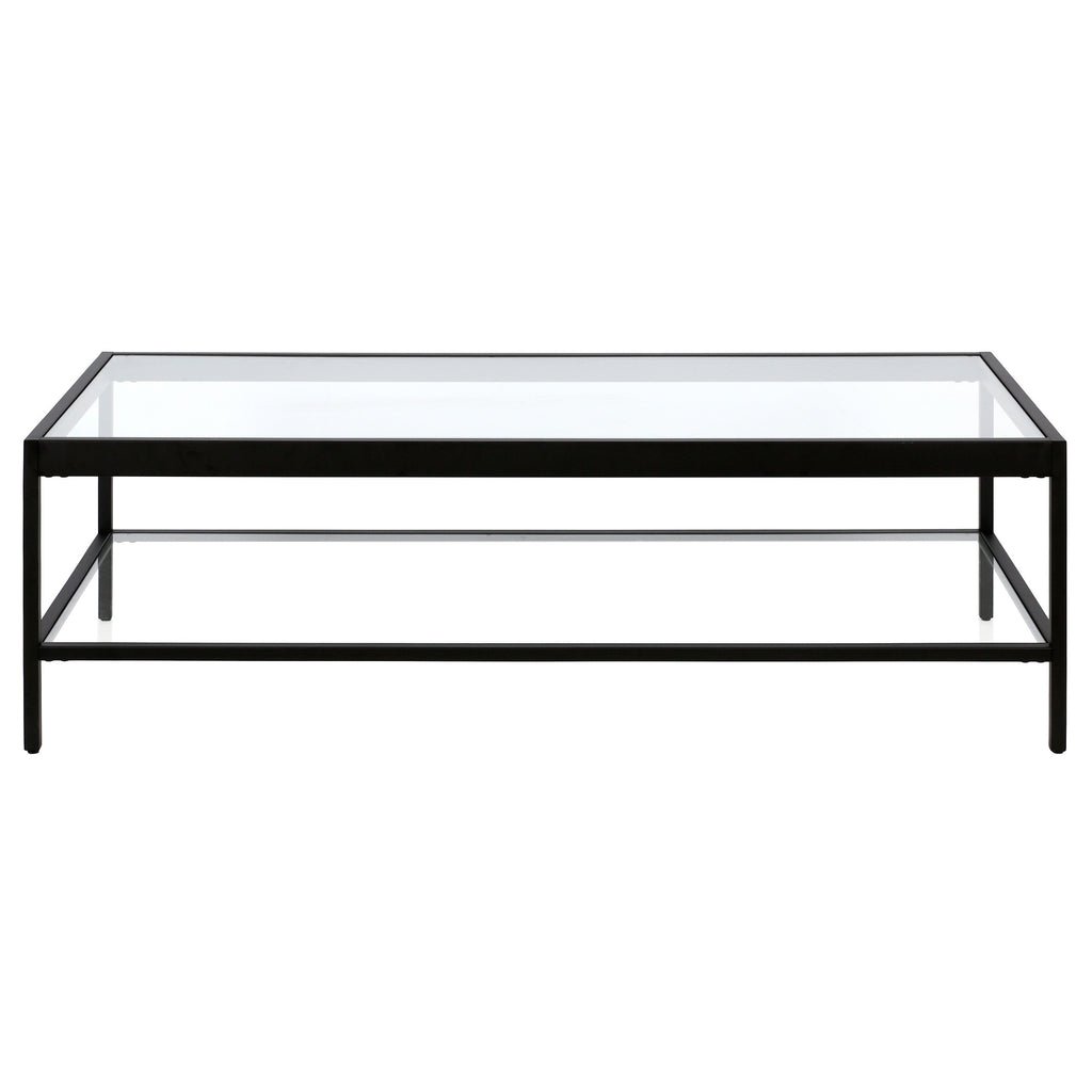 Make your living room or family room really stand out with this 54-inch clear and black glass and steel coffee table with shelf. Quality construction from the blackened steel base combines with clear glass of the top to give this table a fresh and updated look. Includes a single bottom shelf for handy storage or display space. This minimalist rectangular table will be a great accent in any room if you're looking for something that can fit into a living area, bedroom, or office, this coffee table is for you. 17-inch H x 54-inch W x 24-inch D