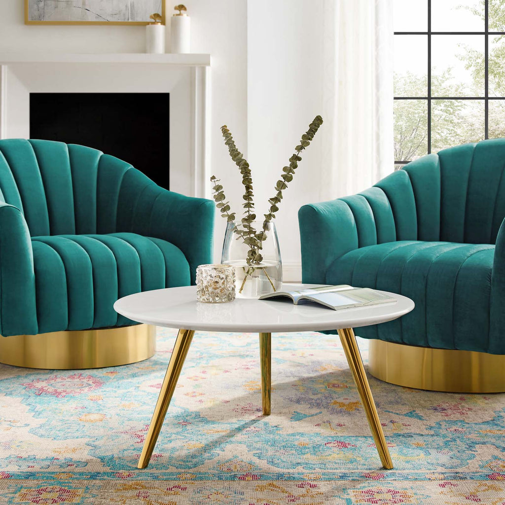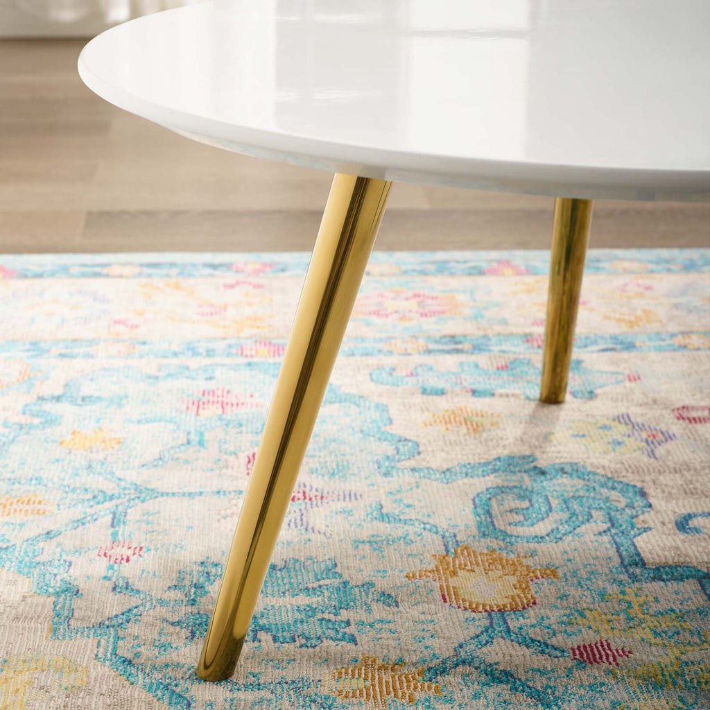 Reflecting a seamless organic shape and timeless form, the Lippa Table has become a symbol of modernism for over the past 60 years. Before its release, homes were filled with clunky remnants of an industrial age long gone by. But in order to advance into the new world, homes first had to transition from the traditional square table, into a piece that connoted progress. A twist on the original design, this coffee table features a round white lacquered MDF table Top lacquered with a scratch-resistant finish and tripod base with tapered metallic gold dowel legs. This rendition of Lippa is a coffee table that's perfect for the living room, lounge area, or home office. Set Includes: One - Lippa 28" Round Coffee Table with Tripod Base