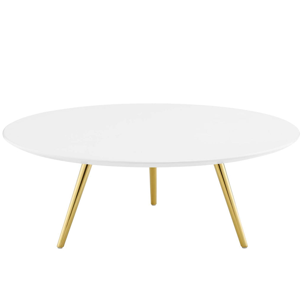 Reflecting a seamless organic shape and timeless form, the Lippa Table has become a symbol of modernism for over the past 60 years. Before its release, homes were filled with clunky remnants of an industrial age long gone by. But in order to advance into the new world, homes first had to transition from the traditional square table, into a piece that connoted progress. A twist on the original design, this coffee table features a round white lacquered MDF table Top lacquered with a scratch-resistant finish and tripod base with tapered metallic gold dowel legs. This rendition of Lippa is a coffee table that's perfect for the living room, lounge area, or home office. Set Includes: One - Lippa 40" Round Coffee Table with Tripod Base