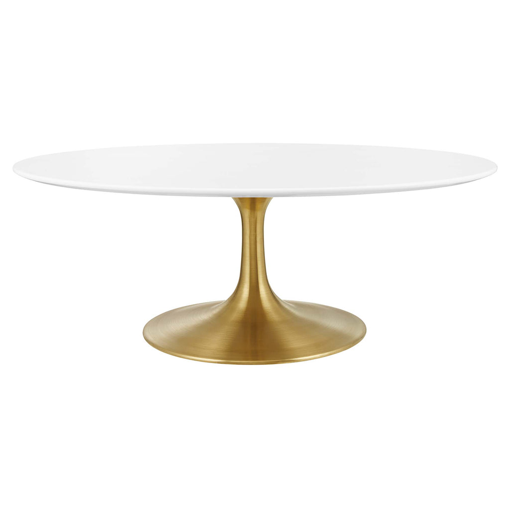 Let modern inspiration flow while gathered around the Lippa 42" Oval Coffee Table. Perfect for hosting a morning cup of coffee or entertaining family and friends, this pedestal table features a spacious surface. Its oval tabletop is crafted with durable MDF with a high gloss finish and beveled edge for a contemporary yet timeless design. Embodying an iconic mid-century silhouette, this pedestal coffee table floats on a sleek metal pedestal base with a chip-resistant brushed gold finish. Includes non-marking felt pad to protect flooring. Assembly required. Set Includes: One - 42 Inch Oval White Top One - Dia51x45cmH Table Base