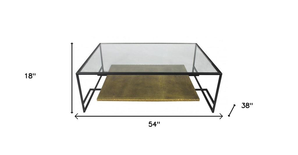 Anchor your living room with this Modern Black and Gold Glass Coffee Table that features a clean-cut trendy design to uphold the aesthetics of contemporary style. The neatly defined black framework is topped with transparent glass for a modern touch while flaunting a lower shelf in a gold chrome finish that offers additional storage space for stacking items or displaying more stylish objects. The clean lines and rich texture of this coffee table will add an elegant touch to your living room while being a practical piece for your home. 54” x 38” x 18”