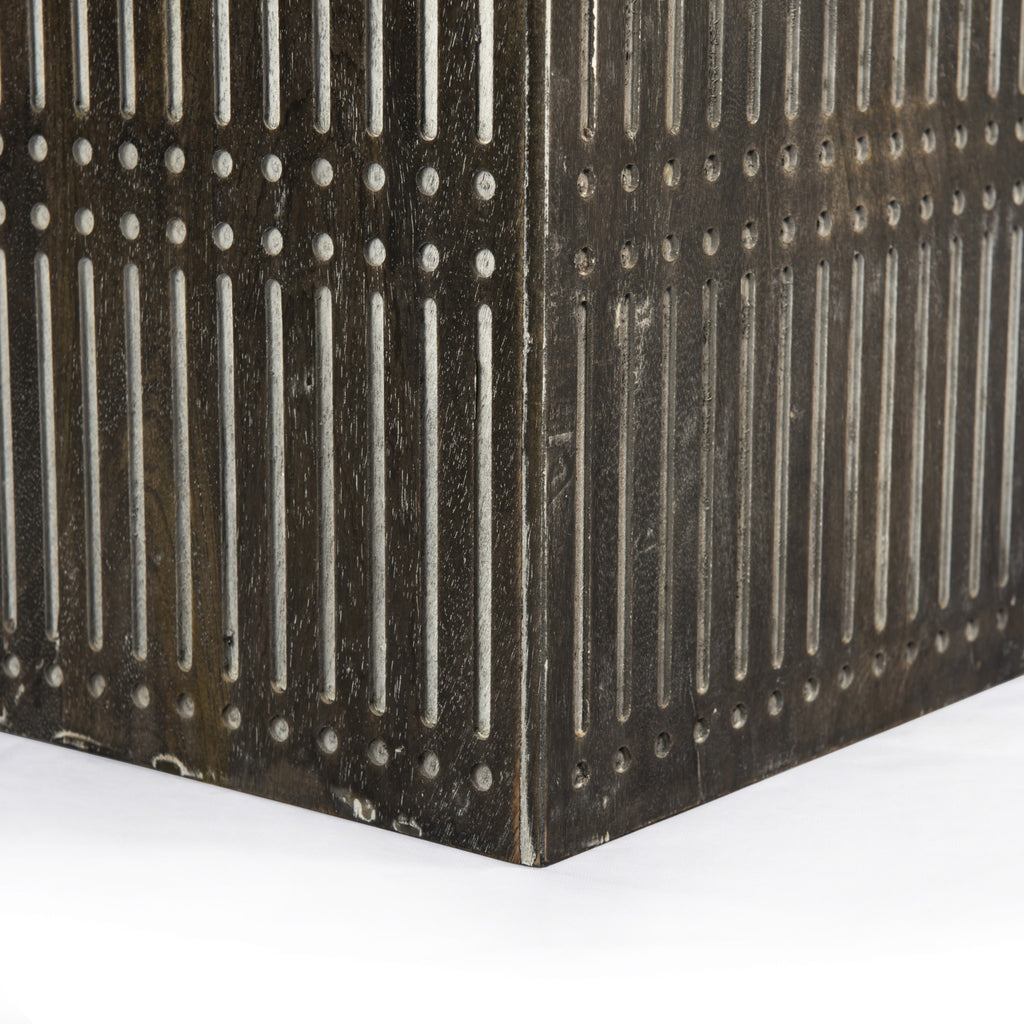 Indivudally hand-crafted, this gorgeous Rustic Carved Wood Storage Coffee Table is a unique and modern way to accent your space and control clutter at the same time. The top of this super cool table lifts so that you can store blankets, pillows, games, and other goodies away and out of site. The hand-crafting and distressing of the delicately carved solid wood brown base gives way to a black textured tabletop for a unique one of a kind look. Practical and good looking, this table is a winner for an updated casually elegant look. 18” x 40” x 40”