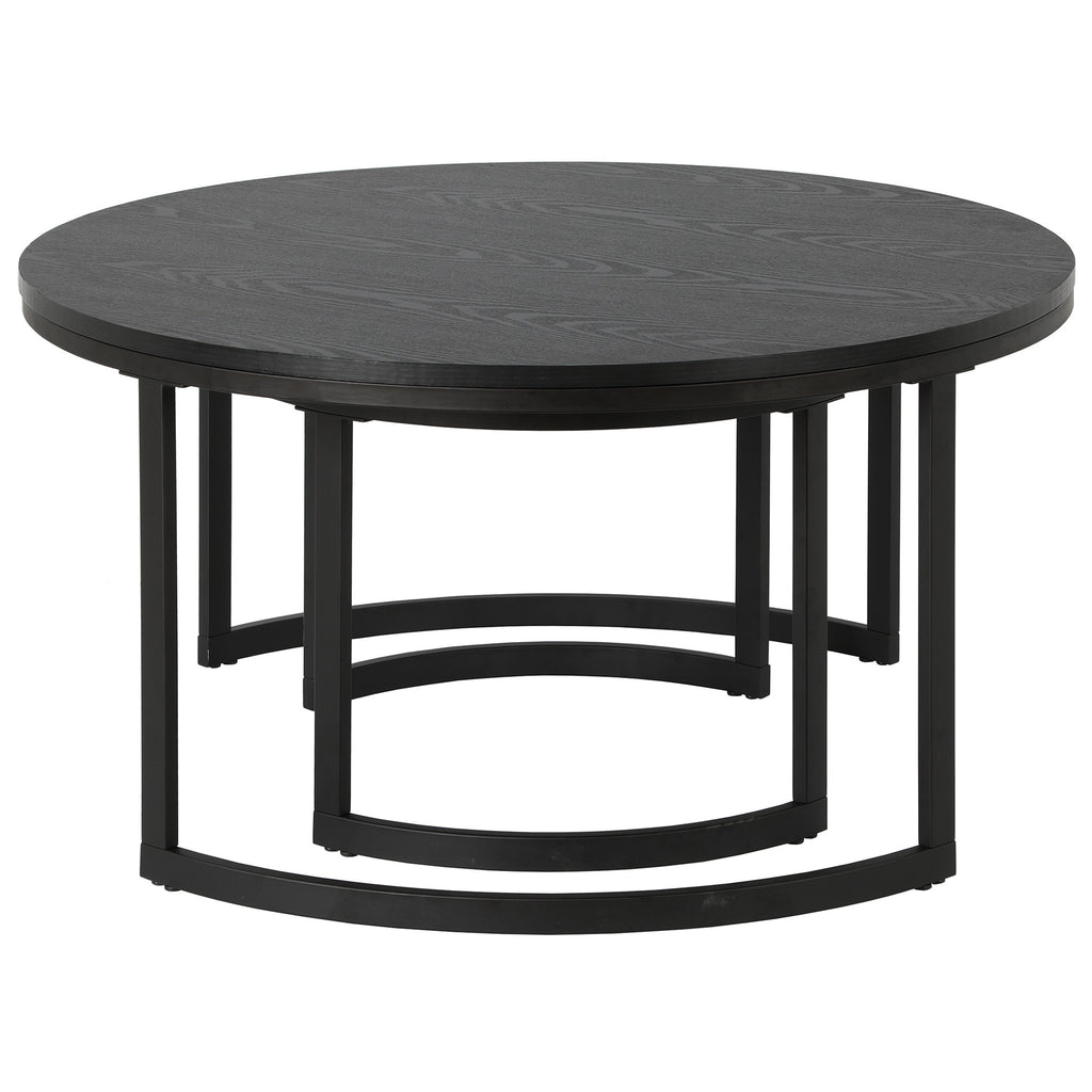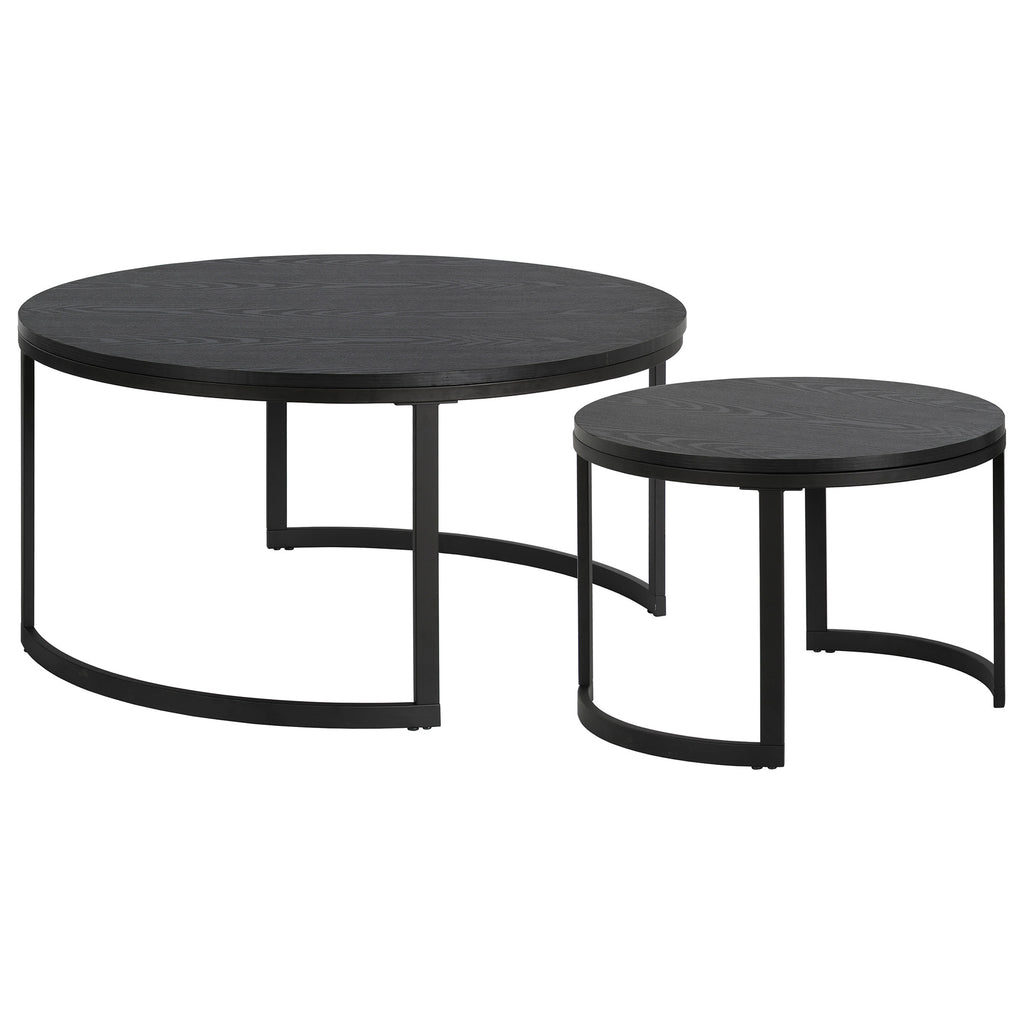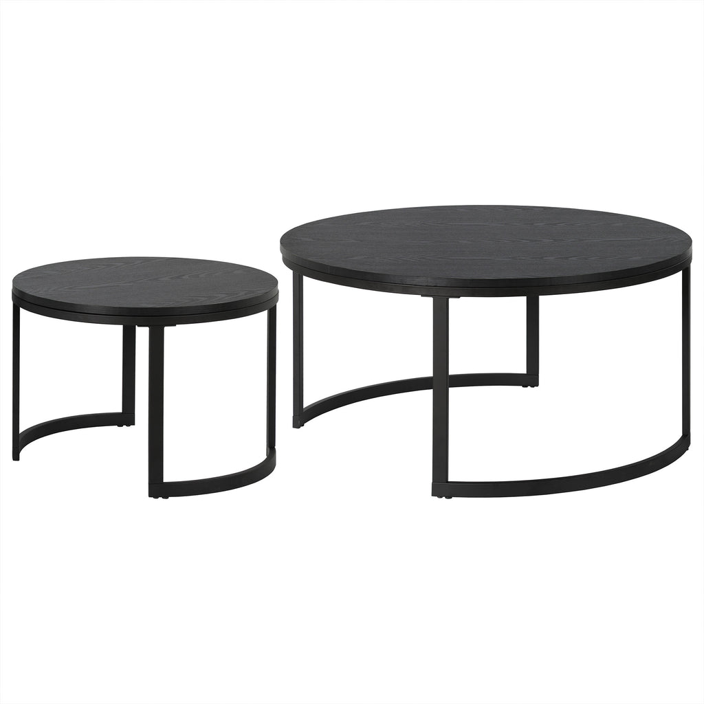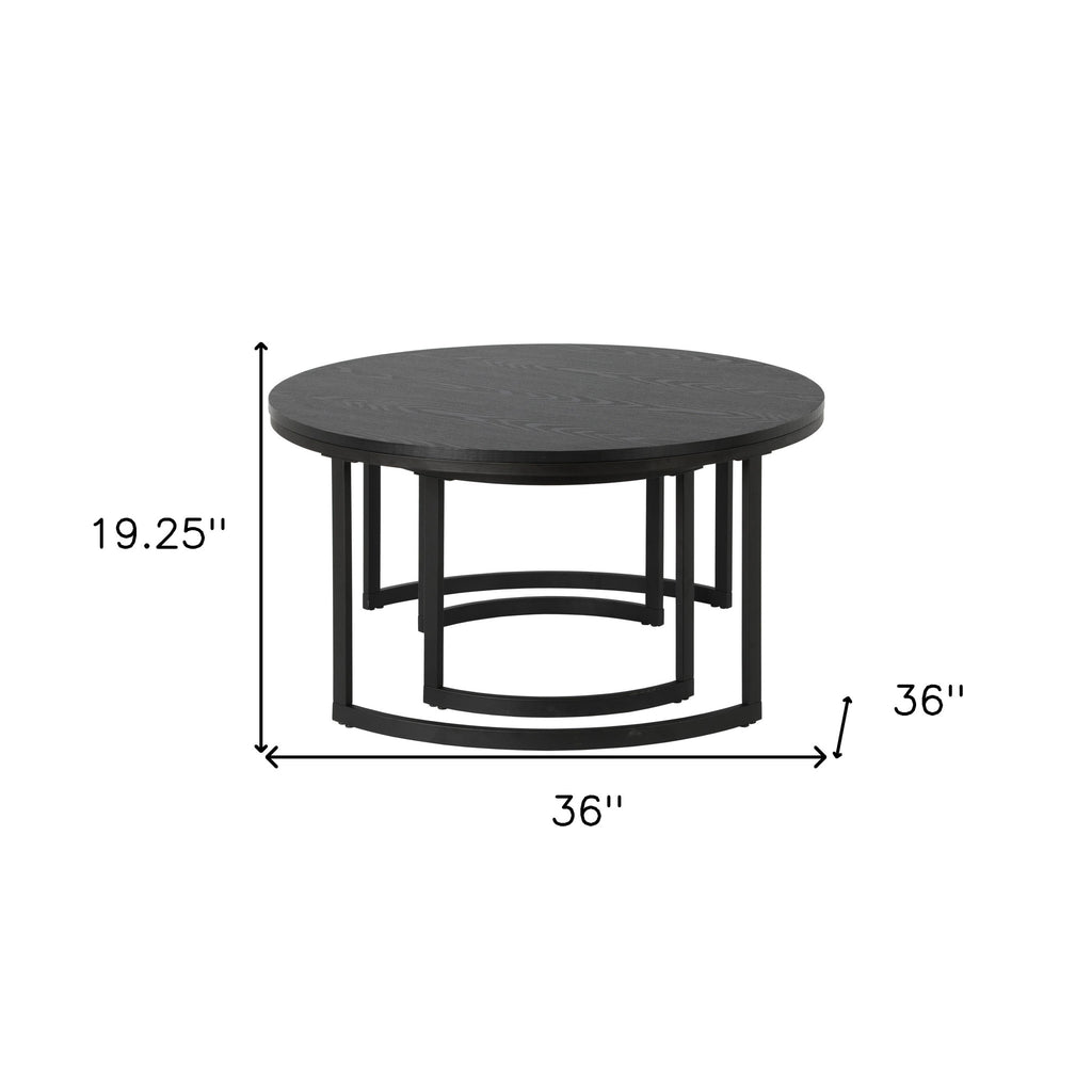 Optimize your space with the set of two 36-inch black steel round nested coffee tables that nest into each other easily and fashionably when not in use. This table features an updated monotone color scheme with black as the main color on both the manufactured wood top and the steel base. This round table features a fresh and stylish shape to give your room a visually pleasing accent. It has a fresh design that will definitely breathe some fresh air into your interior. This coffee table is the sturdy, reliable and stylish answer to your living room needs. 19.25-inch H x 36-inch W x 36-inch D