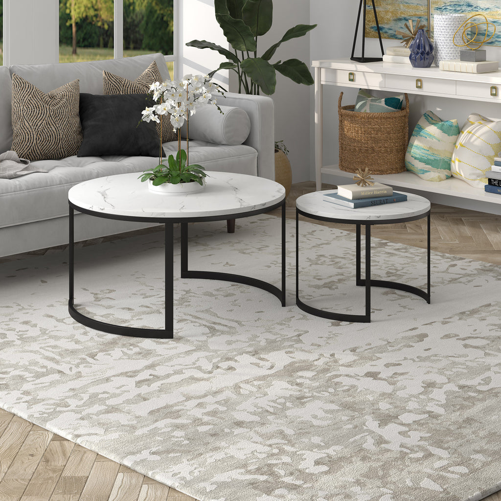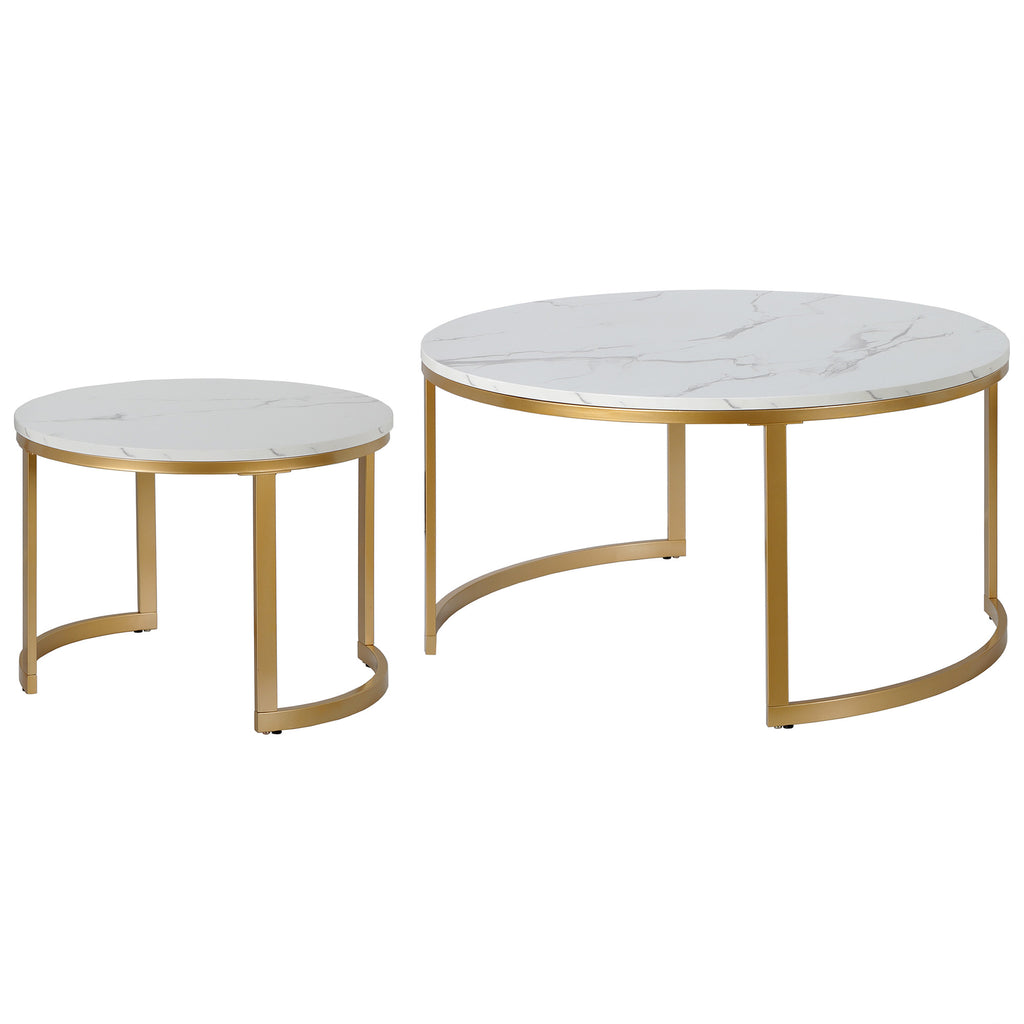 Optimize your space with the set of two 36-inch white and gold faux marble and steel round nested coffee tables that nest into each other easily and fashionably when not in use. The base of this table is made from steel in a gold color that creates a good looking visual contrast to the white faux marble tabletop. This round table features a fresh and stylish shape to give your room a visually pleasing accent. It has a fresh design that will definitely breathe some fresh air into your interior. This coffee table is the sturdy, reliable and stylish answer to your living room needs. 19.25-inch H x 36-inch W x 36-inch D