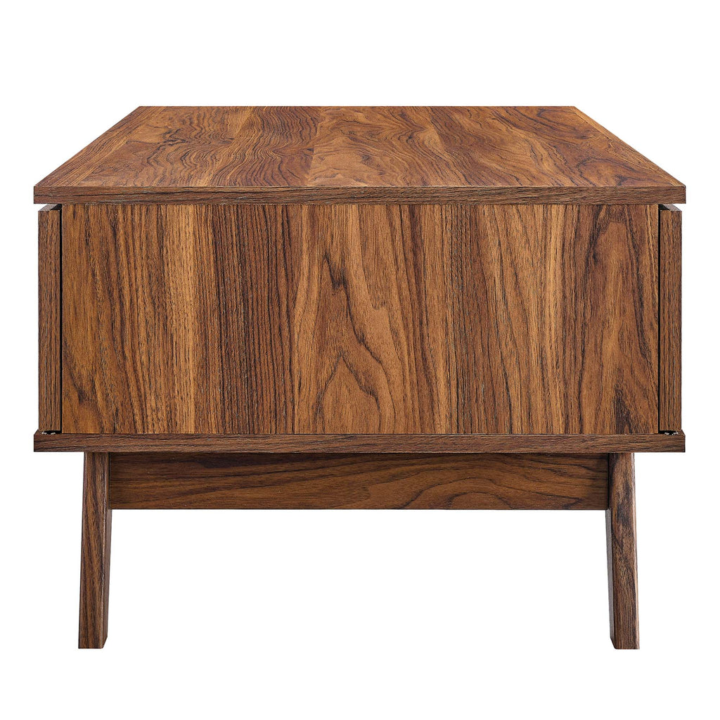 Introduce refreshing style to your living space with the Soma Coffee Table. Showcasing a beautiful rattan weave on the sliding door, this accent table can also serve as a 43" TV stand, accommodating TVs up to 46 inches. This versatile coffee table brings organic aesthetics and modern functionality to the living room, bedroom, home office, or lounge room. Crafted from durable MDF and particleboard with a natural wood grain design, this media table is complete with sliding doors on the front and back to help conceal media essentials and allow for flow through ventilation. Keep visual space clean with ample storage and display space. Includes non-marking foot pads to protect flooring. Weight Capacity: 189 lbs. Set Includes: One - Soma Coffee Table