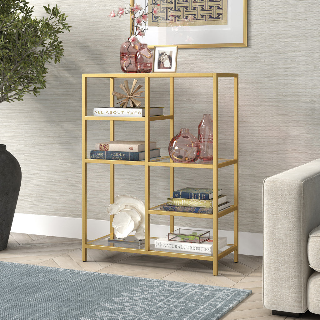 This 42-inch gold metal and glass five tier geometric bookcase is a fresh and updated way to help you keep your space neat and organized. Features 5 shelf tiers for storing books, displaying photographs, plants, or other decorations. Great to use independently or pair with additional units to create a different look and add even more storage. Carefully crafted to fit in tight spaces, you can turn almost any nook into a stunning display showcase for books, plants decor and more. 42-inch H x 32-inch W x 14-inch D