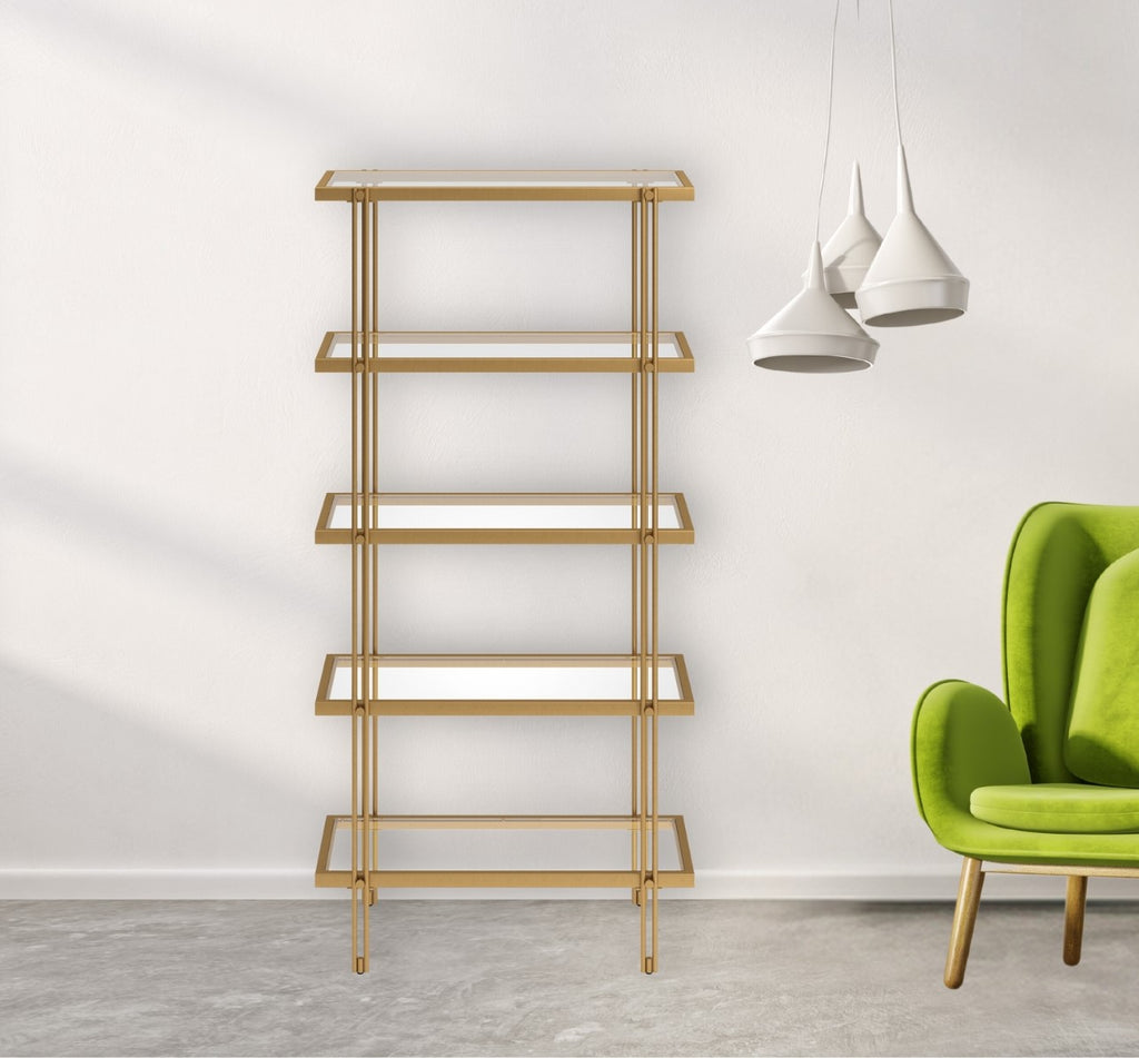 This 68-inch gold metal and glass five tier standard bookcase is a fresh and updated way to help you keep your space neat and organized. The functional 5 shelf tiers offer fantastic storage space. Great to use independently or pair with additional units to create a different look and add even more storage. Increase your room's capacity for storage and display with this great shelving unit. 68-inch H x 33-inch W x 14-inch D