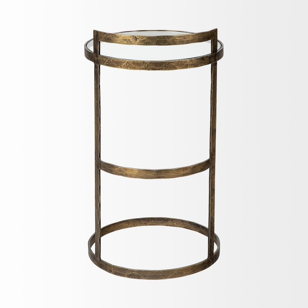 A stunning side table that is comprised of metal and glass. A sleek, antiqued-gold toned, iron base stabilizes and extends to hold the beveled, tempered glass top. The juxtaposition of glass and metal on the Reimer complements its unique, open-cylinder shape and makes it a great choice for spaces based on the design styles.