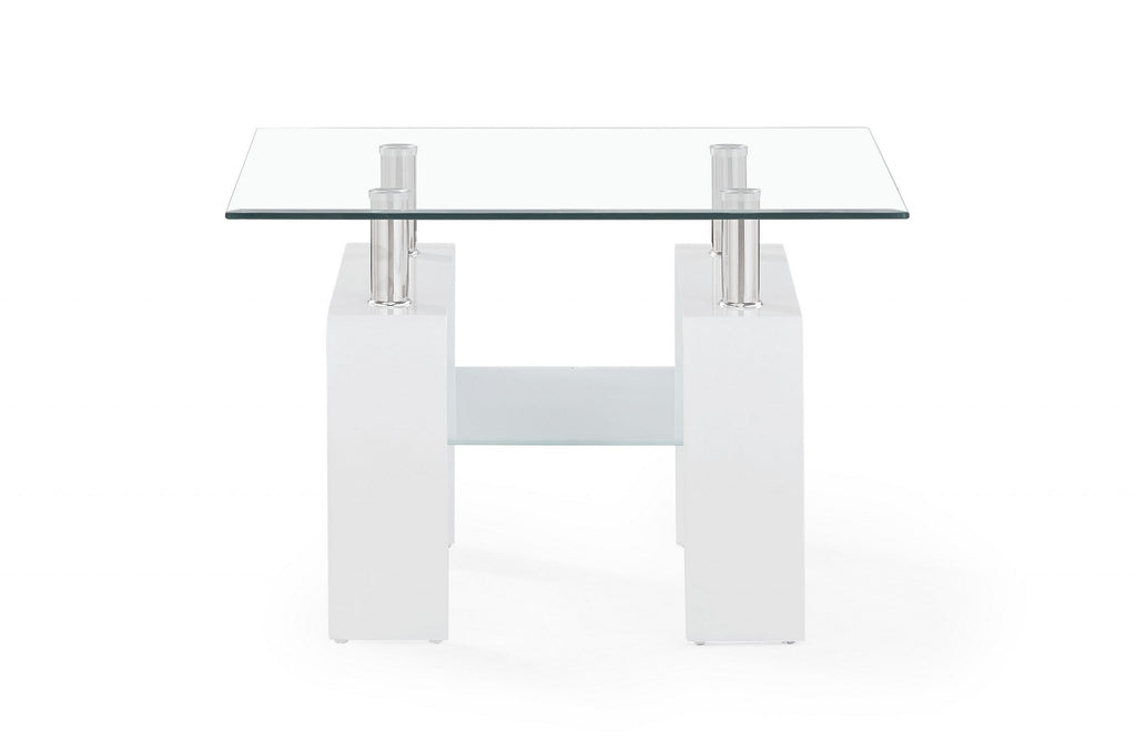 White Glossy Leg End Table With Rectangular Clear Glass Top