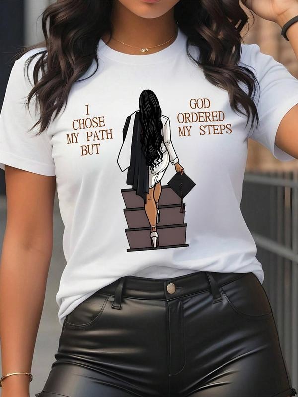 Women's Cartoon & Letter Print Round Neck Tee, Fashion Casual Short Sleeve T-shirt, Ladies Summer Clothes for Daily Wear