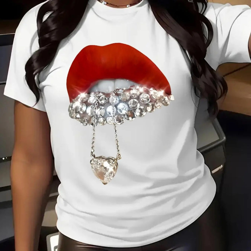 Women's Lip & Rhinestones Print Round Neck Tee, Trendy Casual Short Sleeve T-Shirt for Daily Wear, Ladies All Seasons Tops