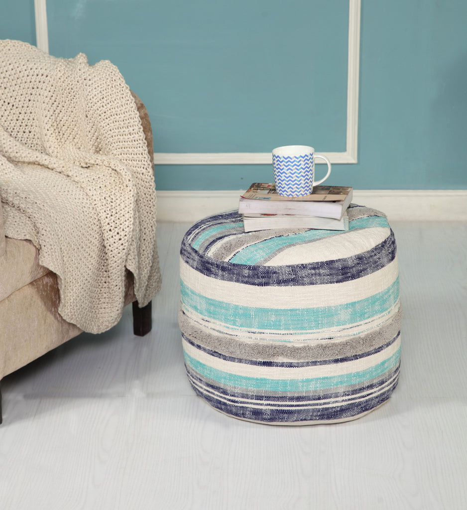 Optimize your space and add some charm to your room with the 18-inch blue 100% cotton ottoman. Easy to blend into most any room, a ottoman is a way to add a good looking accent to your space that can also be practical and useful. . 14-inch H x 18-inch W x 18-inch D