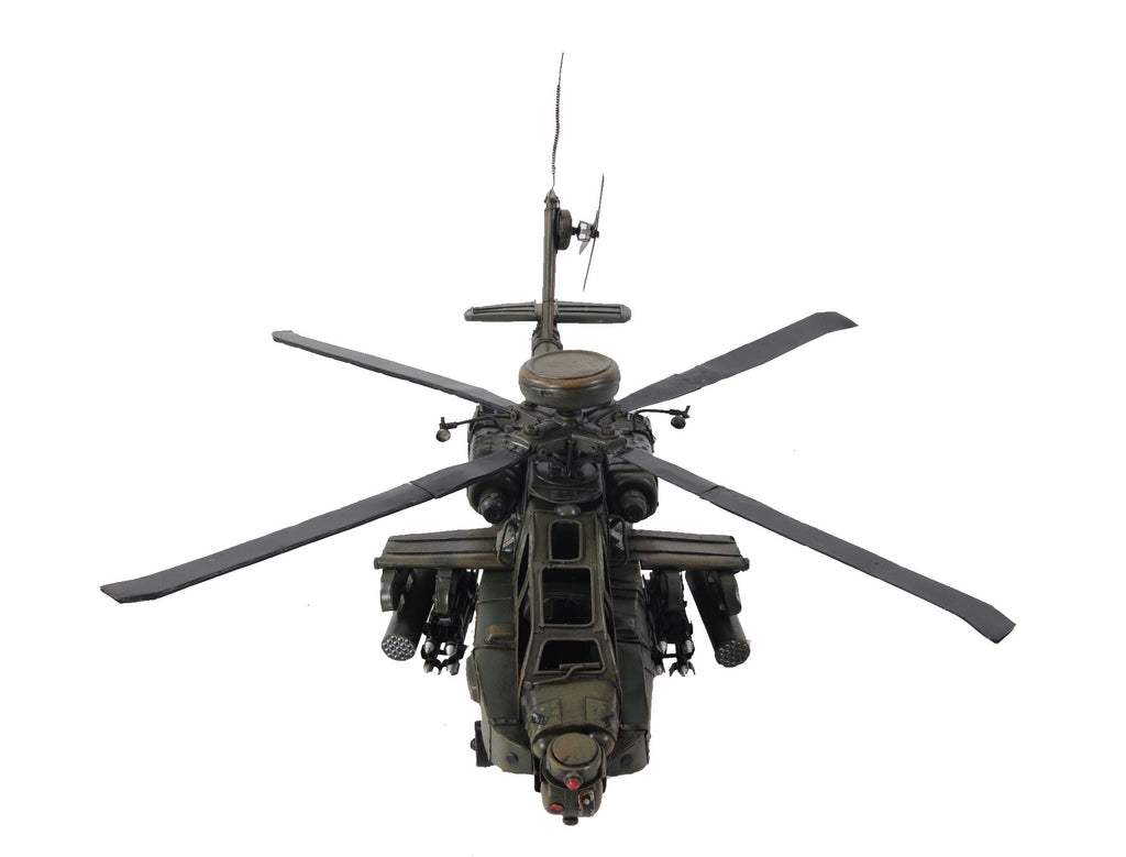 A beautiful replica of the iconic US Army attack helicopter, the Ah-64 Apache Helicopter Sculpture is handmade out of metal and accurately detailed. It comes with remarkable details such as landing skids, a cockpit, tail rotor, spinning propeller, cannons, and missiles. It is a sought-after piece for aviation enthusiasts and collectors. 9" x 18" x 17"