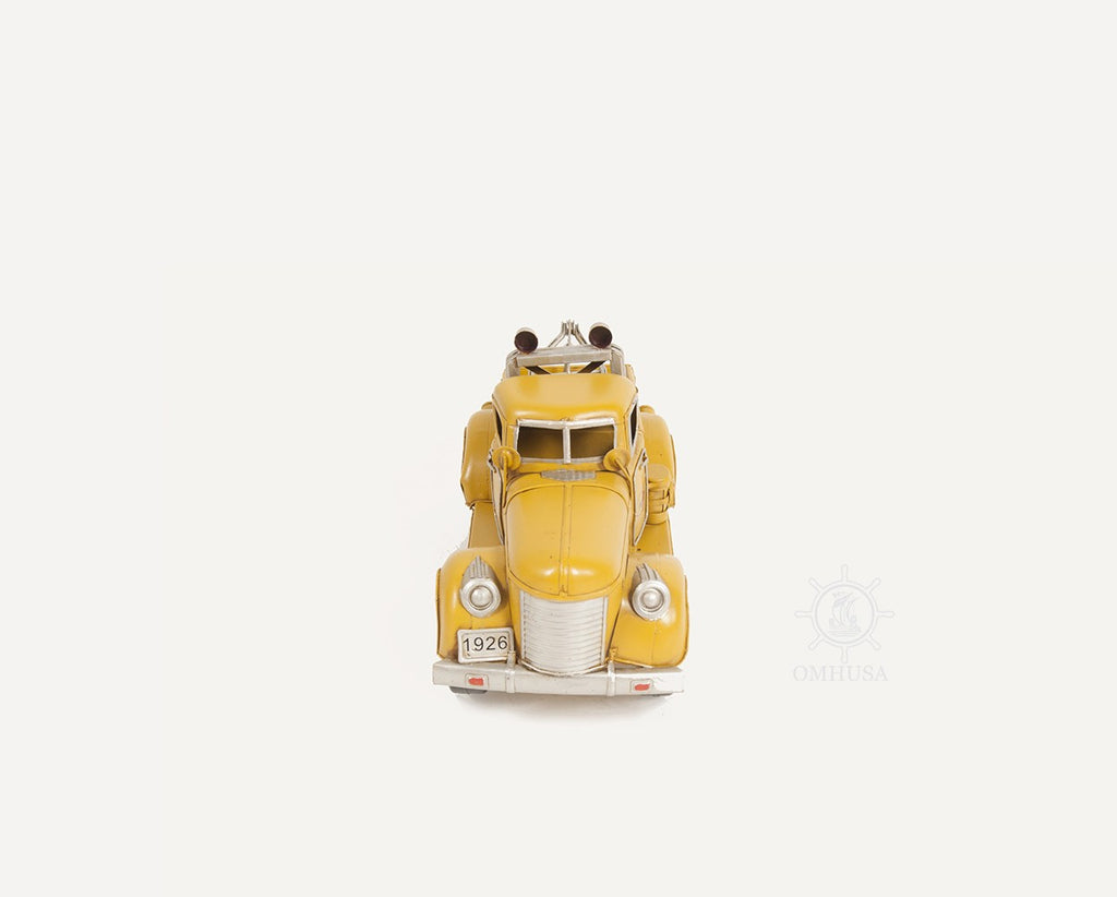 A must have for the collector and enthusiast, this c1926 Pennzoil Tow Truck Yellow Model Sculpture is made of tin and finished in an antiqued yellow color. Designed to be an authentic looking replica, this unique vintage model is a piece of art that comes complete with a 1926 liscence plate, rolling wheels, big fenders, front grill, headlights, side mirrors, crane system, the Pennzoil logo on the doors, front and rear bumper reinforcement and taillights. A great accent for your car enthusiast or tow truck collector! 7" x 12" x 6"