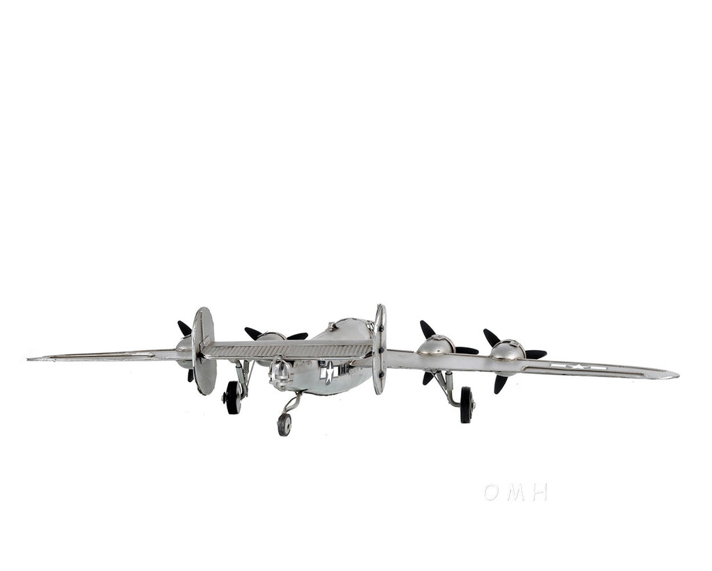 Authentic and super realistic, c1940 B-24 Liberator Bomber Sculpture is a replica of the No.1 heavy bomber of the U.S. Air Force during WWII. It was used for bombing raids in Europe and the Pacific. Made from a metal construction and a clean silver paint finish it is a remarkable collection piece. The rotating propellers and realistic Air Force decals make it super desirable for aviation and WWII enthusiasts. 3.75" x 13.25" x 21.25"