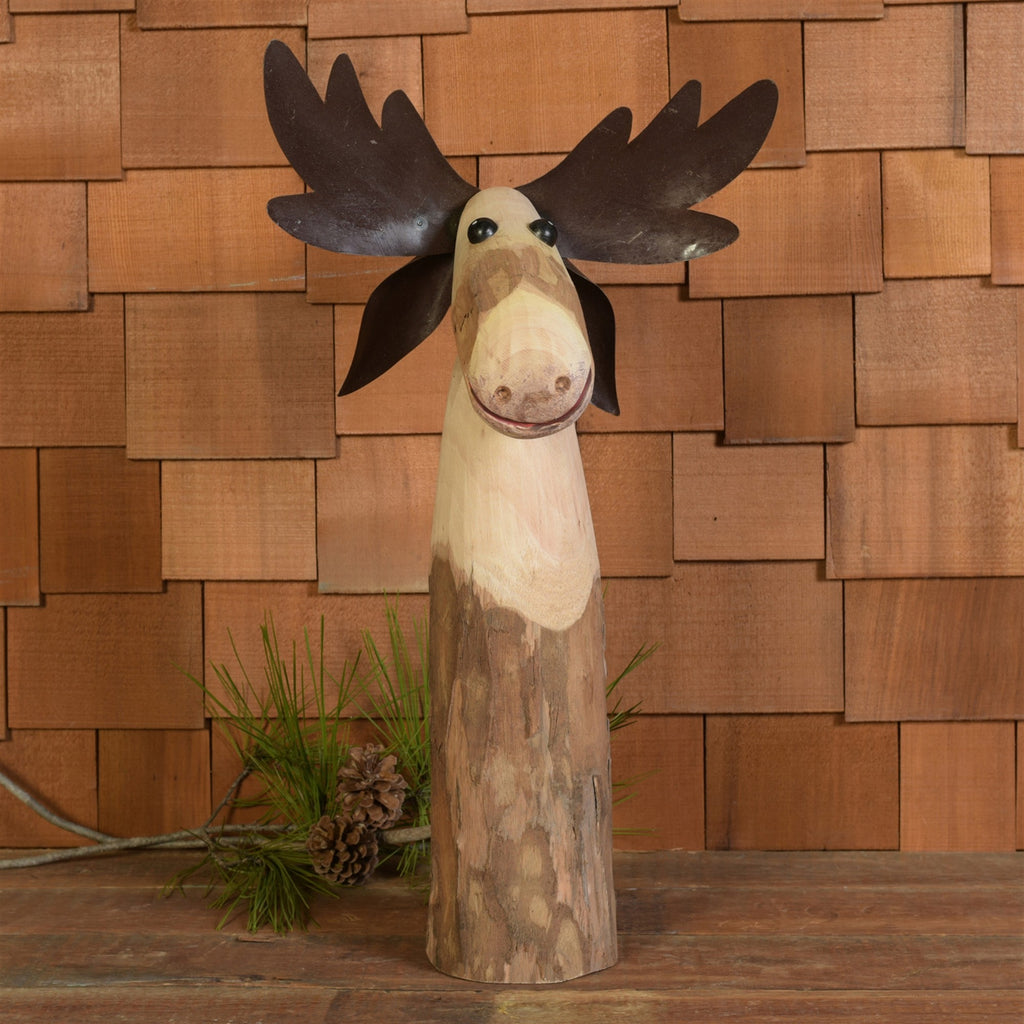 The perfect way to add some whimsical decor to your home, this Jumbo Wood and Metal Moose Sculpture will be a great purchase. The body of this piece is made from solid wood and has a tall and narrow cylindrical shape. The lower third of this cylinder has a dark brown stain on it while the top part has a natural wood finish. The moose head rests on of this and has a minimal details on it. The ears of the moose are made from brown metal which matches the eye details. This whimsical piece will look great anywhere in your home and can be used as playroom decor as well. 24.5" H x 9" W x 13" D