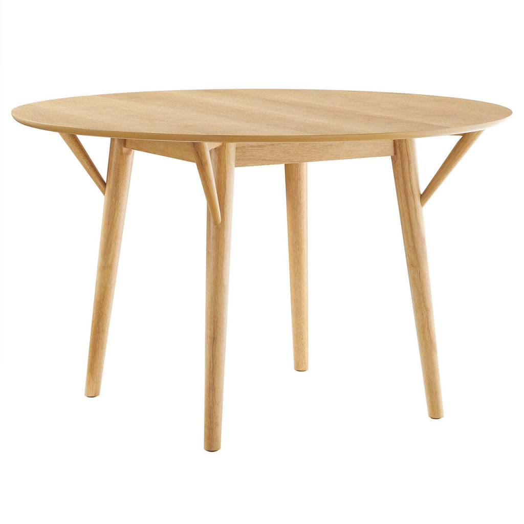 Enjoy dinner with friends or daily mealtimes with the 47" Gallant Dining Table. With a simple round shape, this dining table rests atop splayed and tapered legs crafted from solid rubberwood with angular supports for added interest. This kitchen table is complete with a smooth, durable MDF tabletop and a wood veneer finish that is easy to clean and maintain. A striking addition to the modern home, Gallant emboldens decor in the dining room or kitchen. Assembly required. Set Includes: One - Gallant 47" Dining Table
