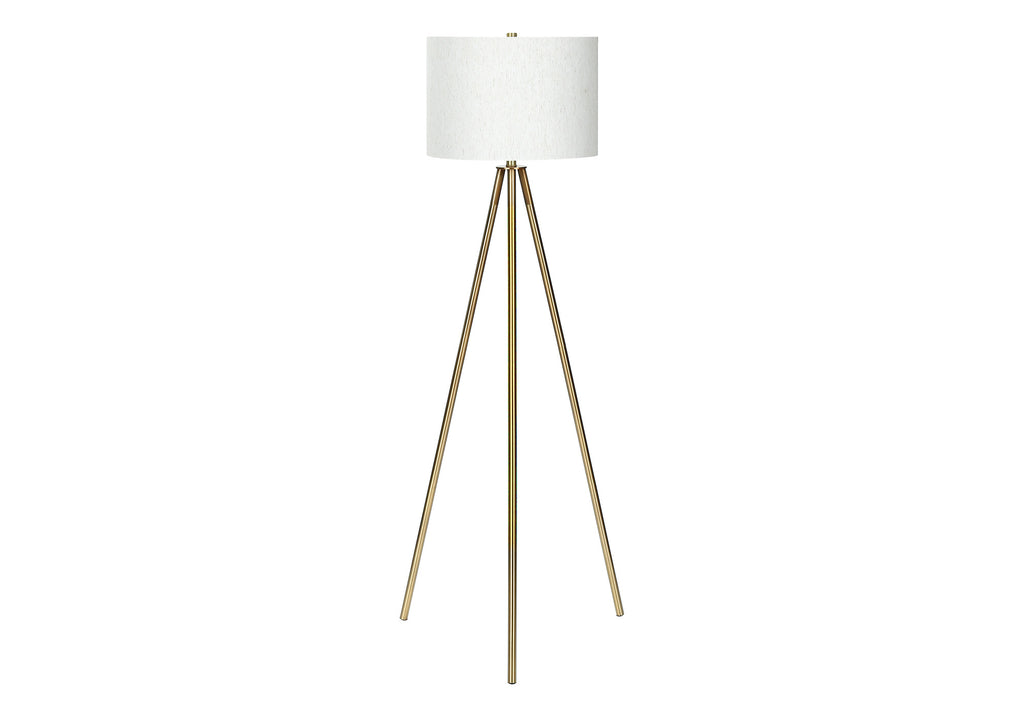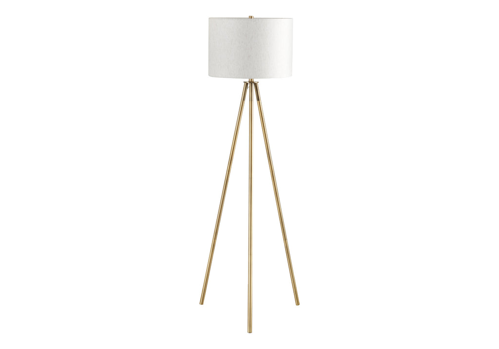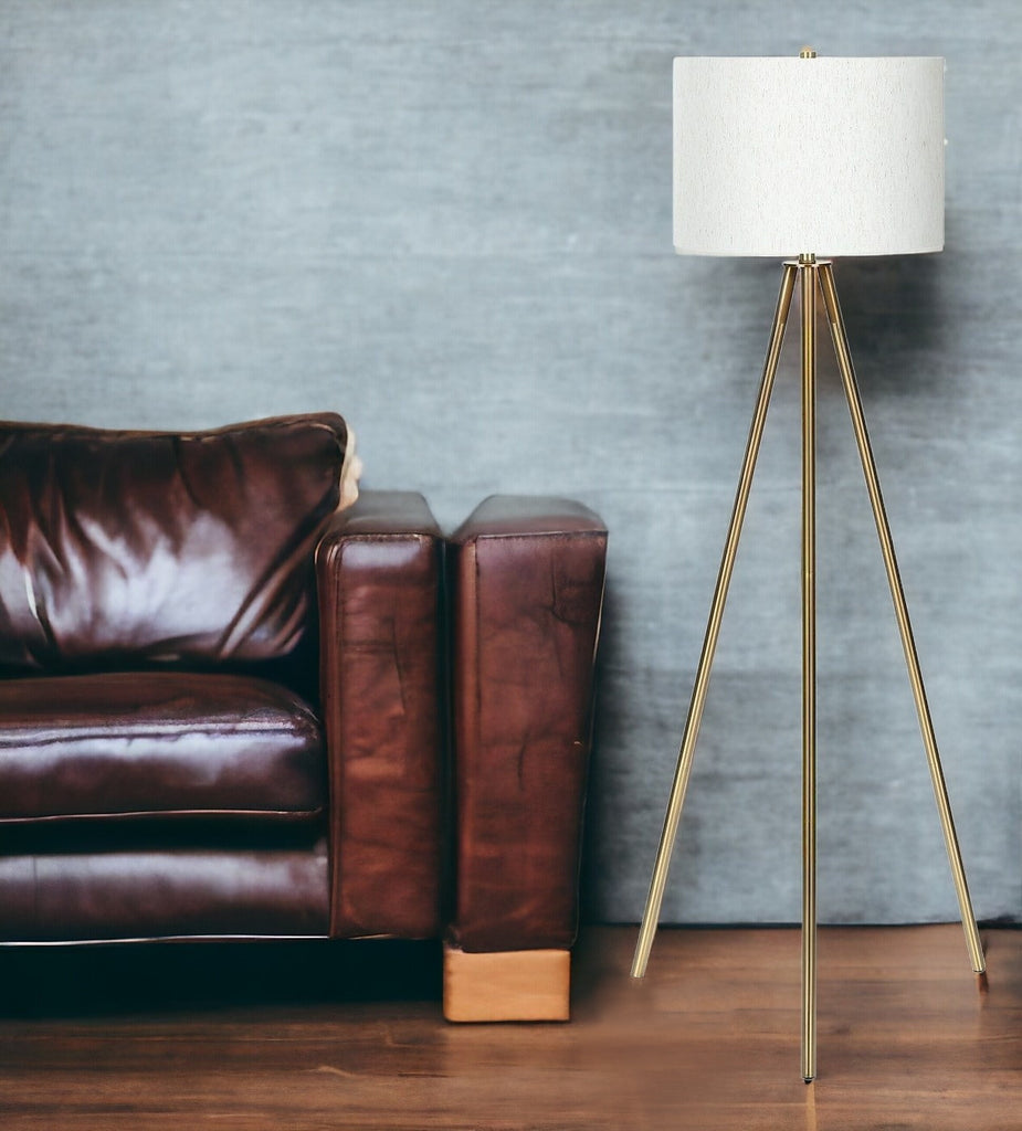 This 63-inch matte gold floor lamp with cream drum shade is the perfect combination of design and function mixed with basic good looks. The lamp is made of sturdy metal and features a matte gold tripod base that is a nice contrast with the creamy beige fabric of the drum shaped shade. At almost 63"H, this tripod lamp is an ideal height for next to your favorite chair or sofa. 62.75-inch H x 24-inch W x 24-inch D