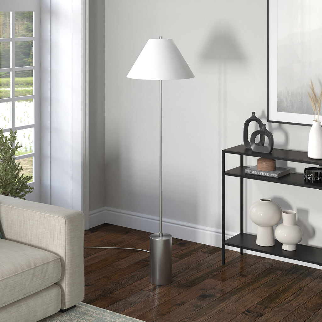 Truly a mix of design and functionality that doesn't compromise on style, this 64" nickel traditional shaped floor lamp with white frosted glass empire shade will be a great addition to your space. A gorgeous nickel metal base bring just the right amount of pizzazz to this fabulous lamp. The lamp shade itself has a empire shape and is made of fabric, which makes it a perfect choice. Classically styled, this traditional lamp features a straight pole that extends upwards from a single base. The light that this lamp throws is soft and warm to elevate the look of most any space in your home. The perfect lamp to create just the right natural and soothing light in your space. 64" H x 15" W x 15" D
