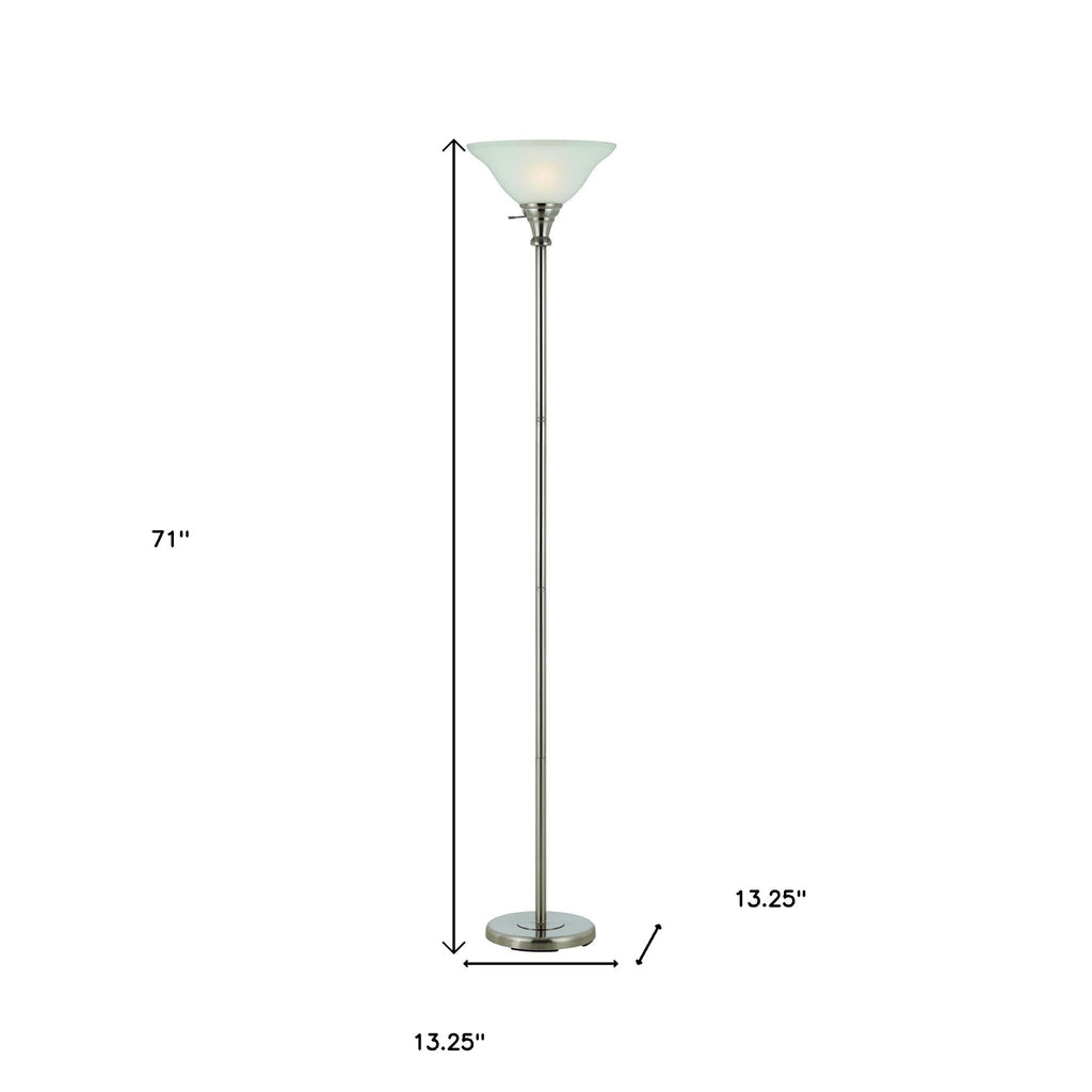 Add a bright anchor to your room with this 71" black torchiere floor lamp with black frosted glass dome shade. The lamp is made of sturdy metal and features a black color. The coloration of the black lamp base creates a fashionable marriage with the the black glass dome shaped shade. Add a soft warm glow to your space with this classic torchiere styled lamp. A straight pole extends upwards from a single base while the scooped shade shape refracts light upward and outward much like it's name sake, a torch. Use this lamp anywhere and elevate the look of the whole space. Bring some lite and good vibes into your space with this updated and stylishly designed lamp. 71" H x 13.25" W x 13.25" D