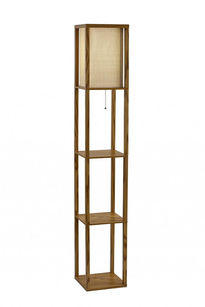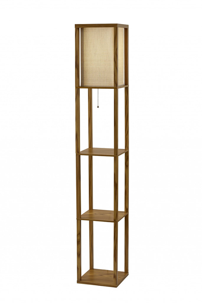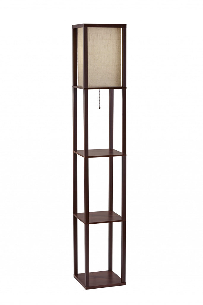 Have it all with style and multi-function. This shelf floor lamp features a walnut wood finished open box frame with two additional display or storage shelves, making it a handy addition to the living room, den, office, or bedroom. The square natural textured shade diffuses light from a 150 Watt incandescent or equivalent bulb. The lamp has on-off functionality with a metal ball accented pull chain switch. This lamp has a clear cord and is smart outlet compatible. The lamp comes with clear wire clips for a clean look. Bulb is not included.