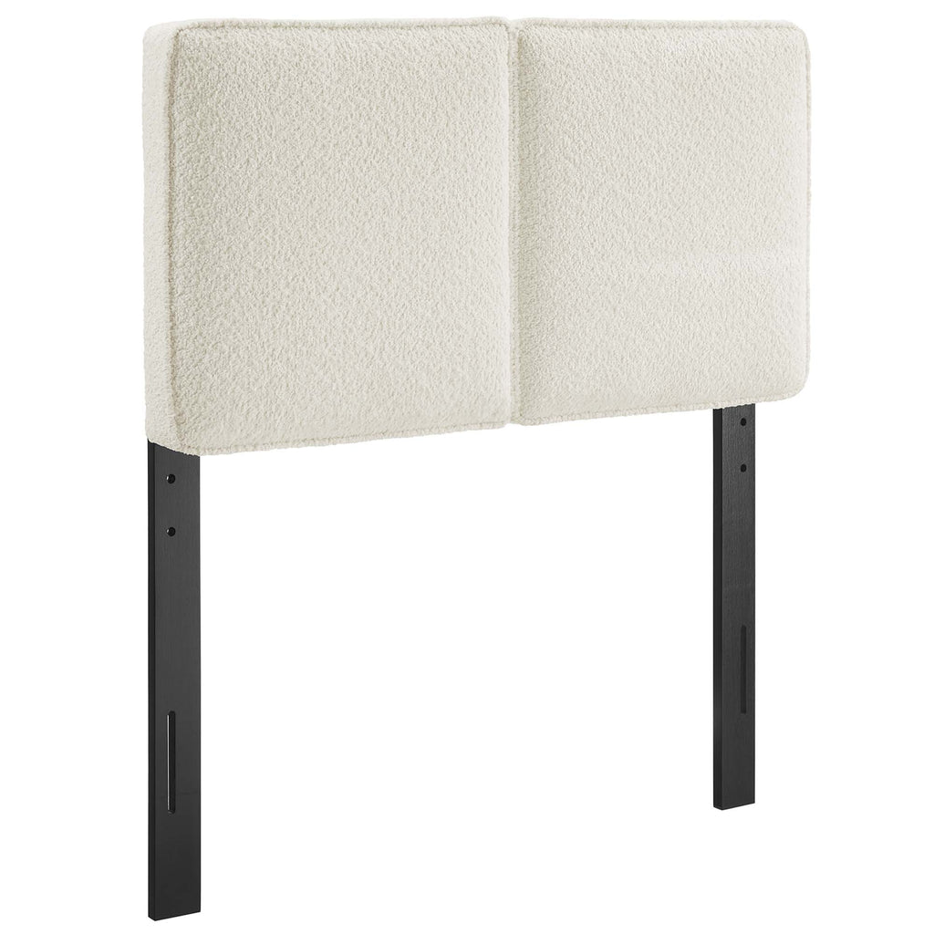 Embrace elegance and comfort in a children's bedroom, college dorm room, or small guest bedroom with the Lindee Twin Headboard, a statement piece that merges plush comfort with sophisticated design. This twin size fabric headboard is upholstered in textured boucle fabric that offers a tactile charm, and features French piping trim that outlines the dual panels. The dense foam padding and pillow-style design grants a soft, cushioned backdrop for nightly reading or relaxing in bed. Supported by solid wood legs and equipped with seven mounting positions, this twin upholstered headboard provides both durability and versatility to fit various bed frames. The Lindee twin size headboard is a transformative bedroom upgrade that combines form and function with an upholstered boucle headboard appeal, making it a quintessential element for any restful sanctuary. Assembly required. Set Includes: One - Twin Headboard