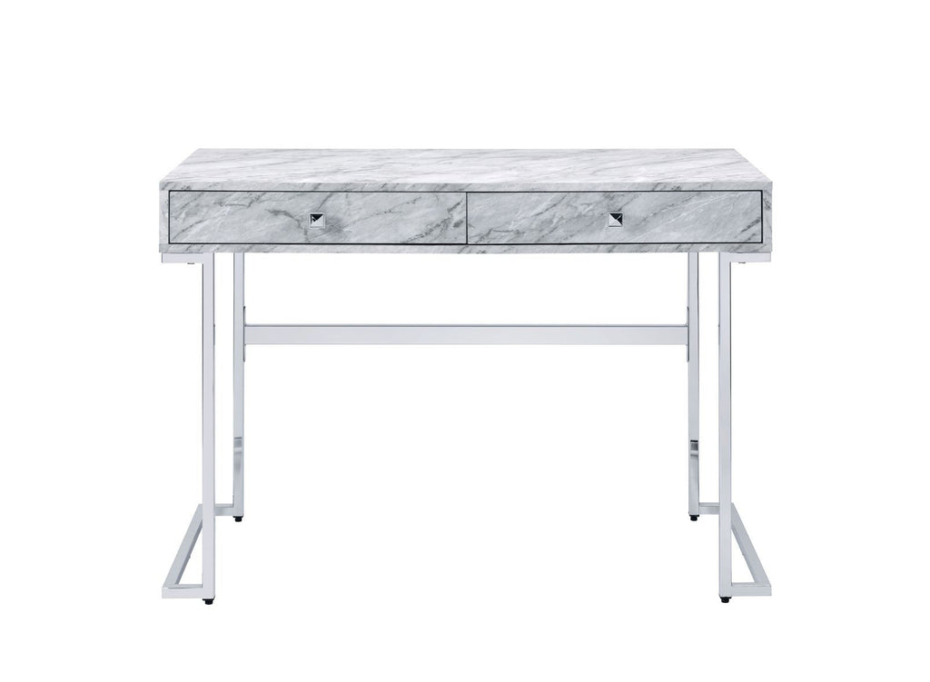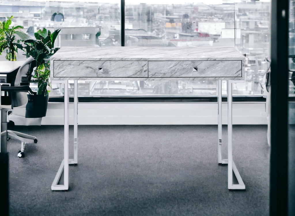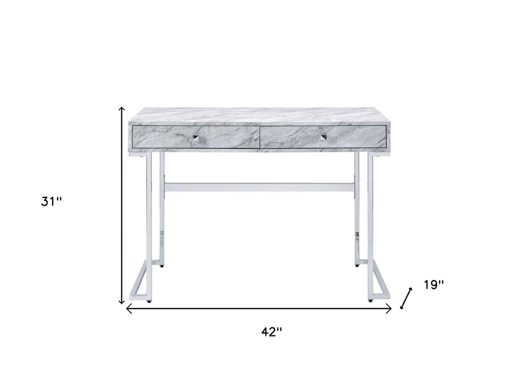 Bring this classic style 42-inch white writing desk with two drawers to your living room, home office or bedroom as a practical and fashionable accent. Designed to easily fit into most spaces, this classically shaped rectangular desk will turn your room into a productive workspace. Made for the ultimate in convenience and versatility, this desk can be assembled in either direction. A pair of drawers gives this desk some hidden storage for your office essentials. Built to last, this sturdy desk is designed for comfort and efficiency for years to come. 31-inch H x 42-inch W x 19-inch D