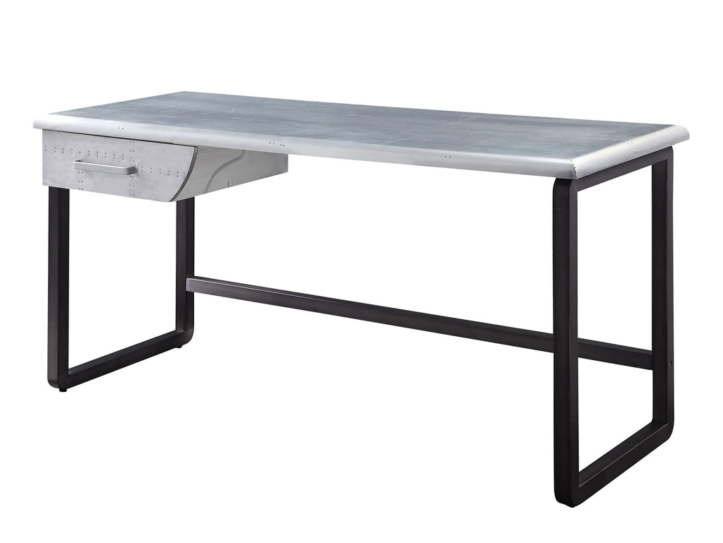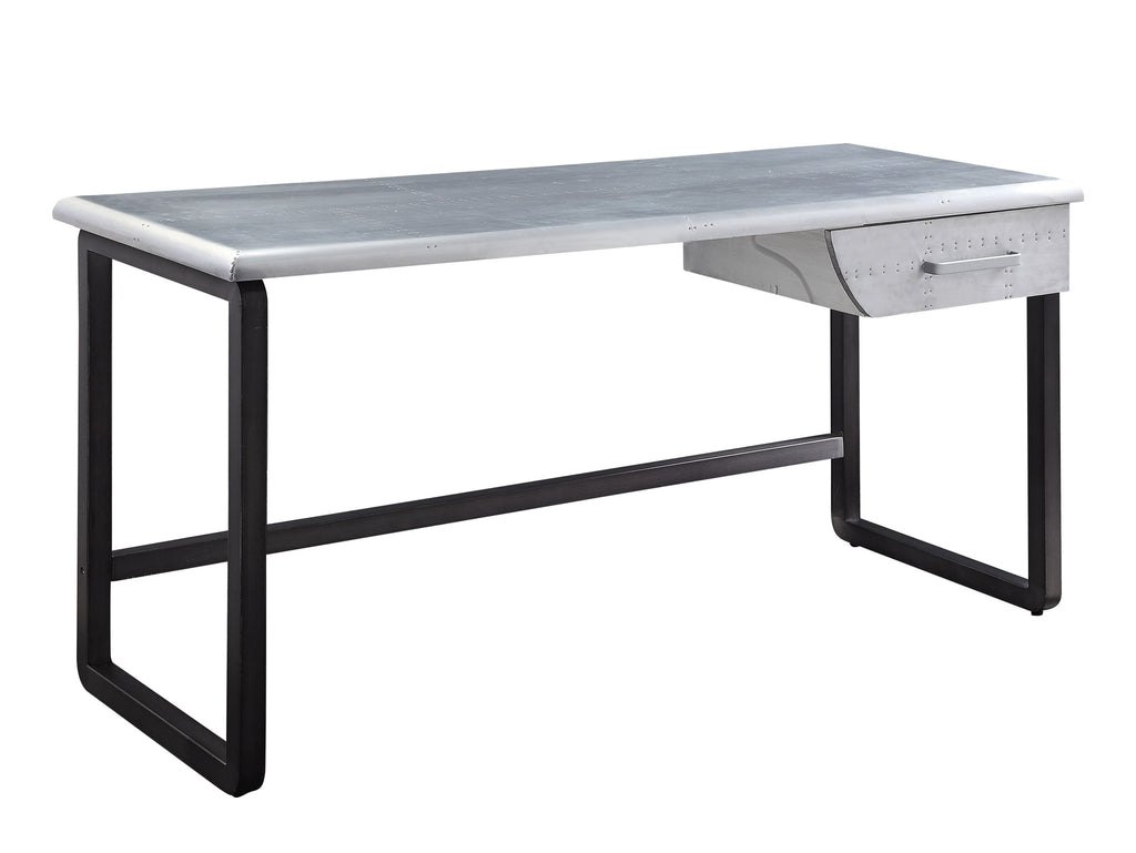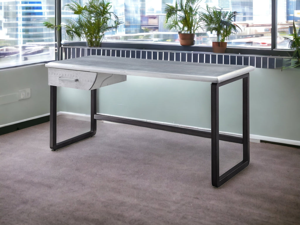 Bring this classic style 63-inch silver and black aluminum writing desk to your living room, home office or bedroom as a practical and fashionable accent. Designed to easily fit into most spaces, this classically shaped rectangular desk will turn your room into a productive workspace. Designed so that you can adjust to your room and style preferences, this desk can be assembled in either direction. A single drawer gives this desk some hidden storage for your office essentials. Built to last, this sturdy desk is designed for comfort and efficiency for years to come. 30-inch H x 63-inch W x 25-inch D