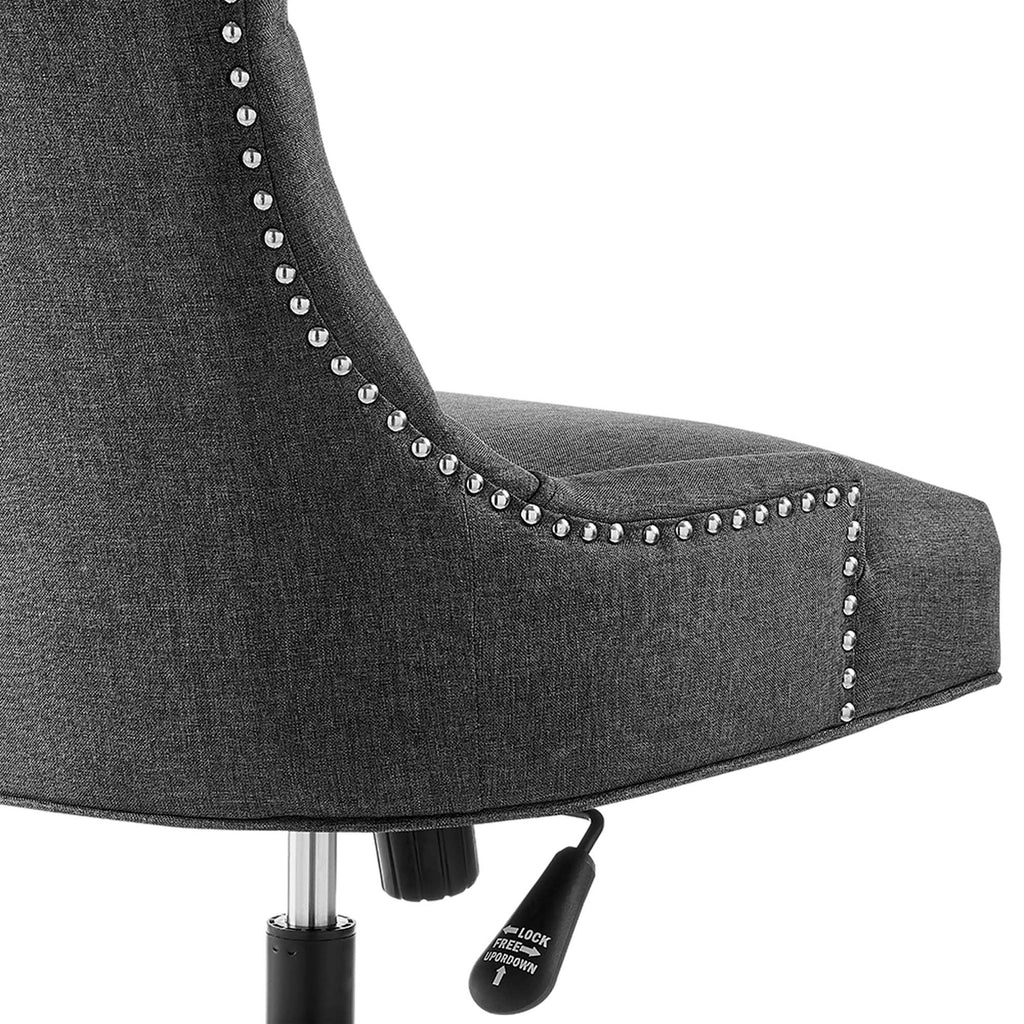 Introduce vintage flair and glam deco appeal with the Regent Tufted Fabric Swivel Office Chair. Metal nailhead trim and tufted buttons provide visual depth, while a luxuriously padded upholstered fabric back and seat for exceptional support to this superbly constructed computer desk chair. A matte black metal base and five single ball nylon casters provide easy movement over hardwood or carpeted surfaces while a full 360-degree swivel, tilt tension control, and pneumatic height adjustment create a custom seating experience for optimal performance. Perfect for the modern home or office, this fabric office chair is a desirable addition to any workspace. Chair Weight Capacity: 287 lbs. Set Includes: One - Regent Tufted Office Chair