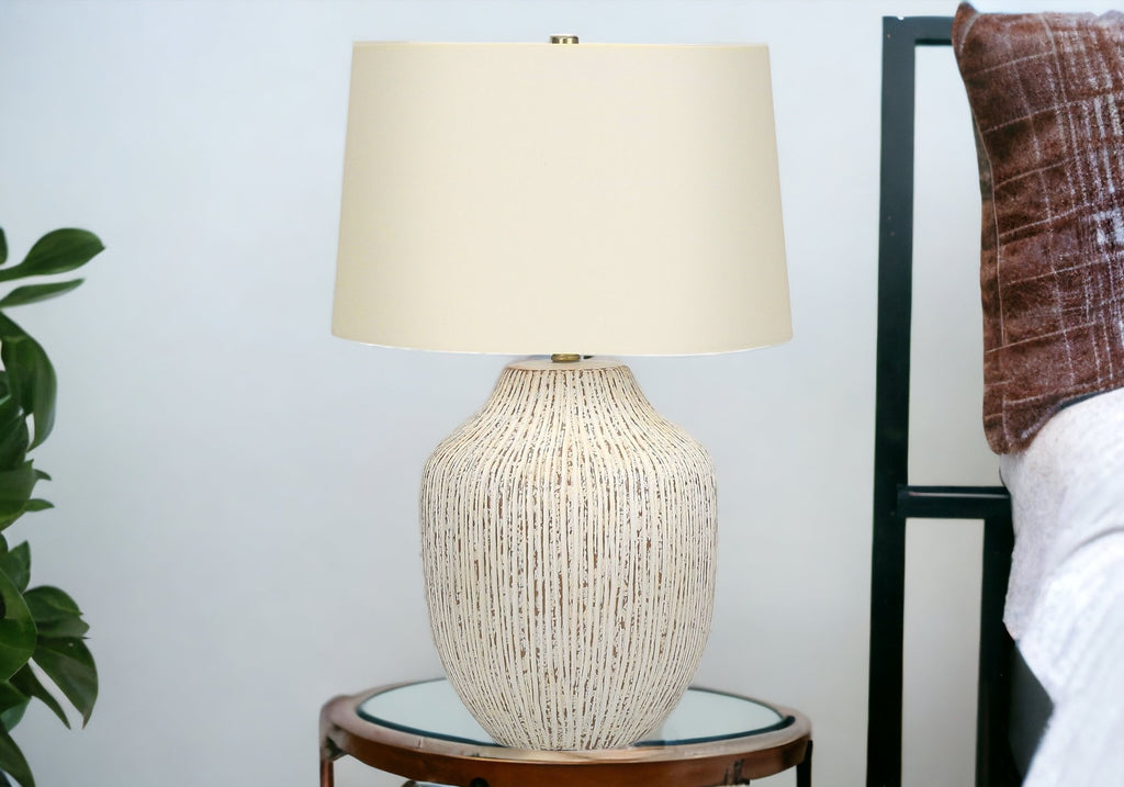 This 26-inch cream ceramic round table lamp with cream empire shade is a great way to add some brightness to any corner of your home. A gorgeous cream colored textural ceramic base brings just the right amount of pizzazz to this fabulous lamp. The cream empire linen shade is a great compliment to this lamp. This standard table lamp is designed to provide general lighting to the area. Use this lamp anywhere and elevate the look of the whole space. Bring some lite and good vibes into your space with this updated and stylishly designed lamp. 26-inch H x 17-inch W x 17-inch D