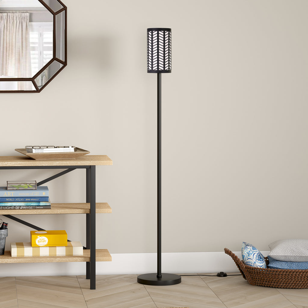 With this 63" black torchiere floor lamp with black drum shade you bring design along with some warm ambient lighting to your space. The base of this lamp is made of black metal. The lamp light itself is covered by a metal, drum shaped shade, making this a classy piece that will complement most any interior. Add a soft warm glow to your space with this classic torchiere styled lamp. A straight pole extends upwards from a single base while the scooped shade shape refracts light upward and outward much like it's name sake,a torch. The light that this lamp throws is soft and warm to elevate the look of most any space in your home. The perfect lamp to create just the right natural and soothing light in your space. 63" H x 11" W x 11" D