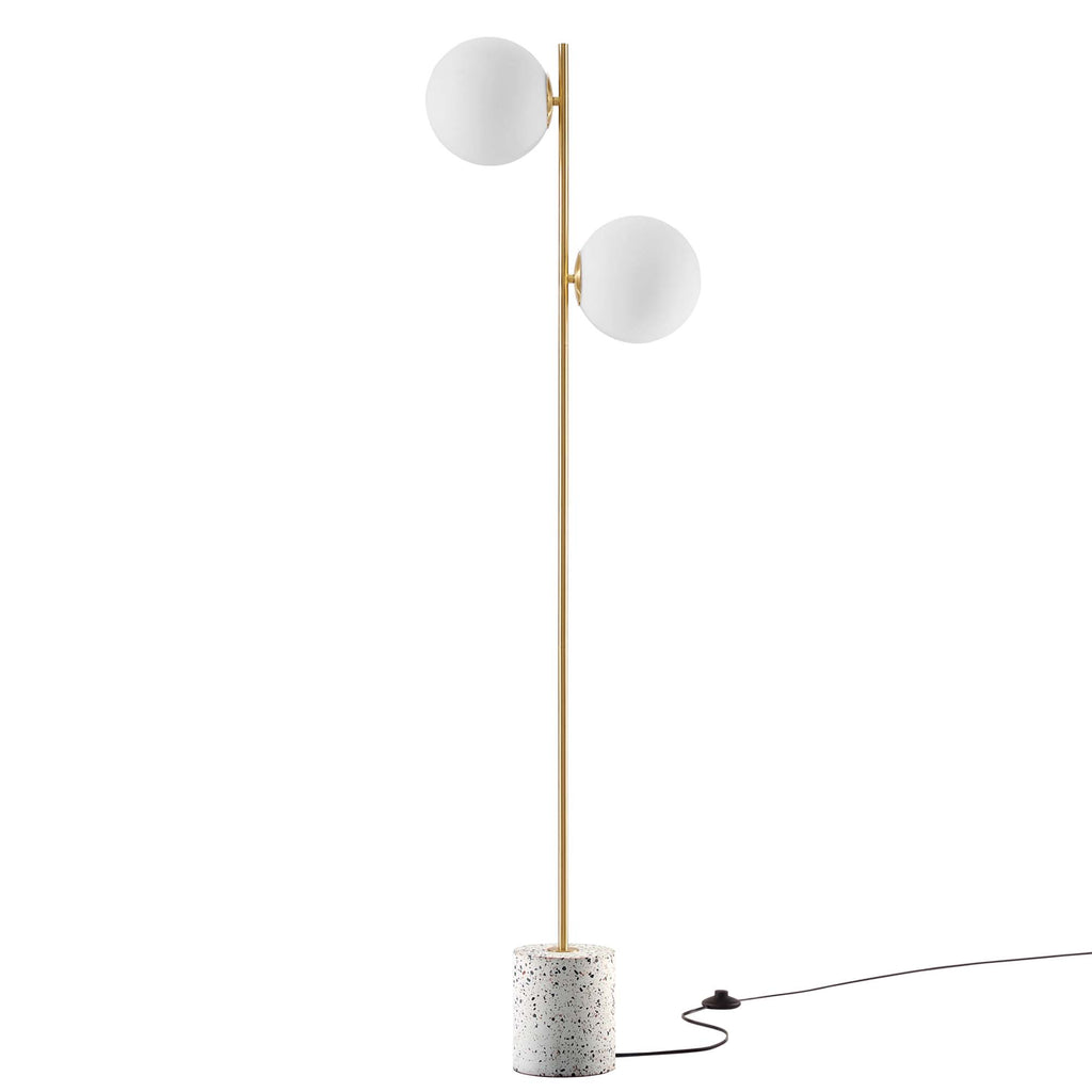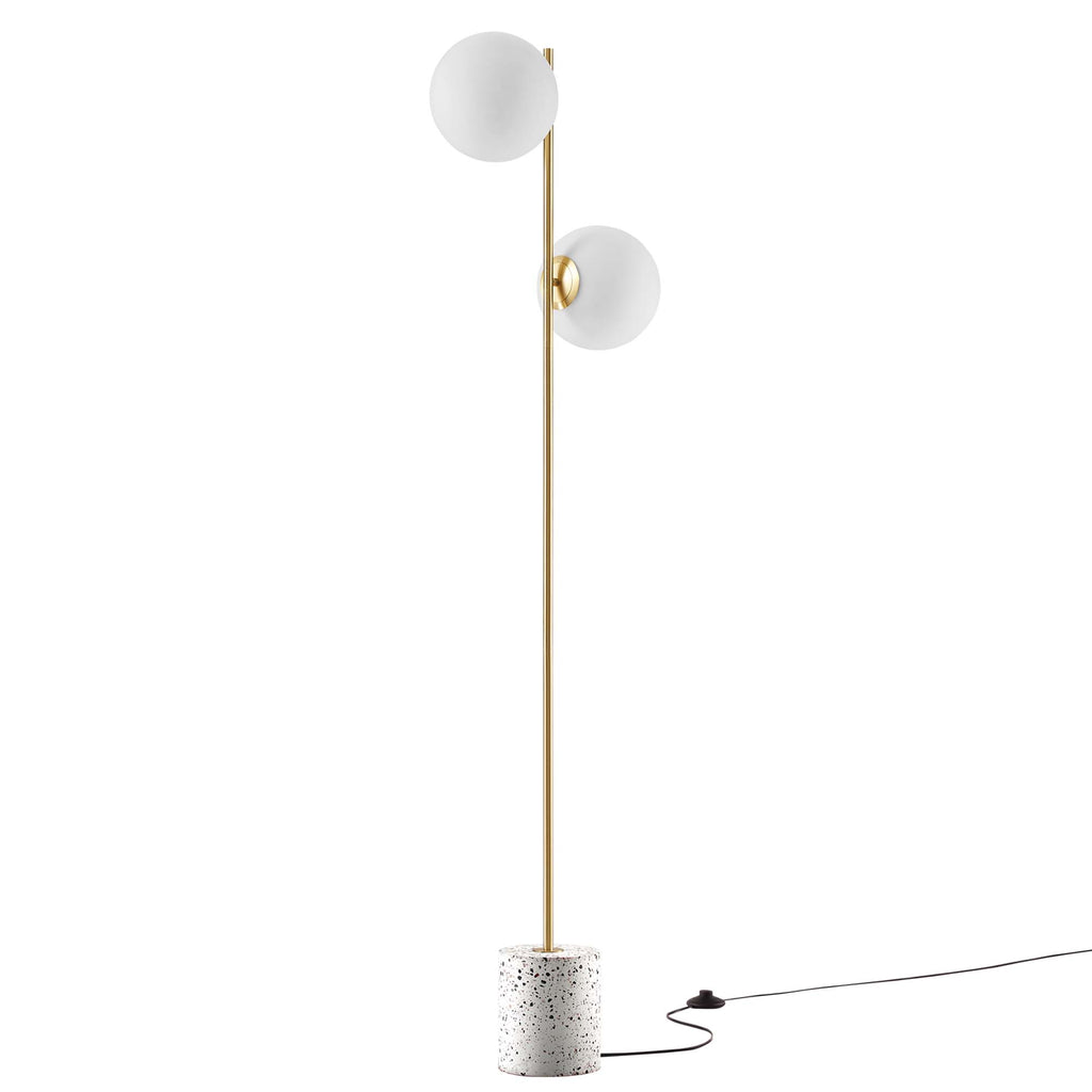 Bring intrigue into your home ambient lighting with the Logic 2-Light Terrazzo Floor Lamp in your bedroom, living room, office, entryway, or study. This standing lamp dispenses a tranquil aura complementing mid-century modern, contemporary, or eclectic decors. Logic features two opaque glass globe shades set vertically on a satin brass rod rising from a terrazzo cylinder base, a captivating light for the living room. This sculpted reading floor lamp, equipped with a black power cord and an on/off foot switch, takes 2 G45 E12 40W max bulbs or LED equivalent (not included). Compatible with dimmer switches (not included). Assembly required. Clean with a soft, damp cloth. Set Includes: 1 - Logic
