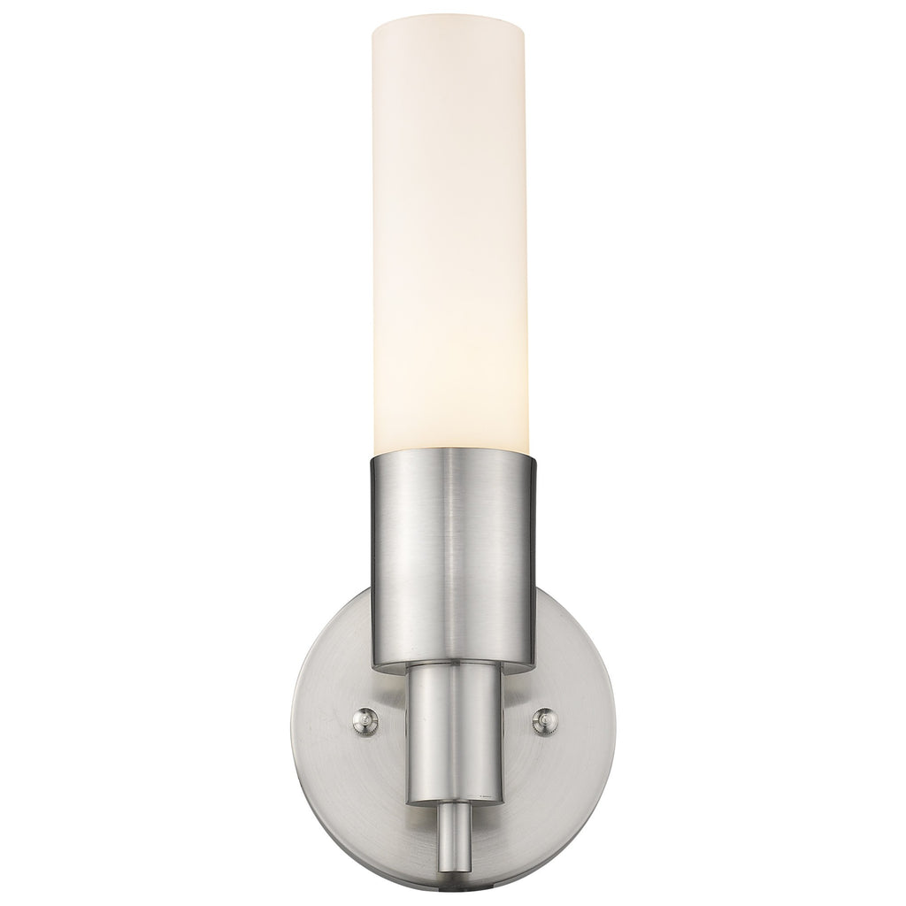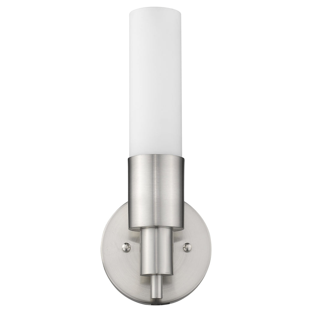 This Silver Narrow Wall Light with Frosted Glass Shade will be the perfect way to update the light fixtures of any space in your home. The wall bracket is a simple round shape and colored to a silver finish. Attached to it is a smaller metal rod which is attached to the base of the main light. The base has a three-tier cylindrical shape and a frosted glass narrow cylindrical shade on top. This wall light will look great on its own in your entryway or hallway, or you can use a group of them to elevate the look of any room in your home. 13.5" H x 5" W x 4" D