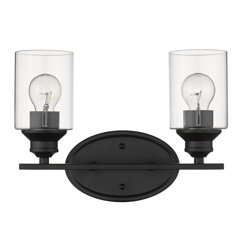 Add depth to your minimalist aesthetic while adding brightness to your space with this Two-Light Matte Black Wall Light with Clear Glass Shade. The wall bracket has a general oval shape with beveled edges and is colored to a matte black finish. Attached to it are two small rods that hold the flat rod up on top of which the two lights sit. The base of each light is two-tiered and is colored to the same matte black finish. The shades are made of clear glass and have a wide cylindrical shape. The contrast between the clear glass and matte black hardware gives this wall light a very unique look. Use it anywhere in your home and elevate the look of any space. 9.88" H x 14" W x 5.75" D