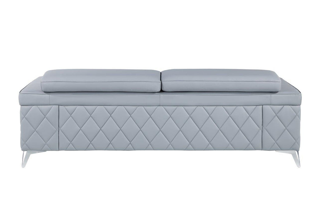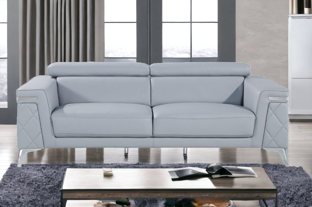 Superior construction from fabulously soft and high grade leather gives this 89-inch gray and silver italian leather sofa a leg up on the competition. The premium leather used makes your lounging luxuriously comfortable and adds an elegant appeal to your space. Solid colors give you lots of decorative options and are easy to work into your decor scheme. Sinuous springs construction gives this piece strong support and makes it comfortable to sit even for long periods of time. Square arms offer a comfy place to rest. Silver stainless steel legs effortlessly elevate the room and add a touch of contemporary design. A great showpiece for your room, this sofa is a must have. 42-inch H x 89-inch W x 38-inch D
