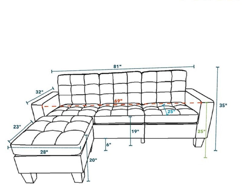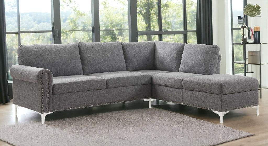 The gray polyester l shaped two piece sofa and chaise sectional is spacious design meticulously crafted with extraordinary cushion comfort and ultimate durability so everyone in your home can have the best seat in the house. This solid color sofa and chaise sectional is made from soft, sturdy, and resilient 100% polyester that is a good option for families and in frequently used seating areas. Solid colors give you lots of decorative options and are easy to work into your decor scheme. This piece includes high end detailing such as nailhead trim for a refined look. Round arms offer a comfy place to rest. Silver metal legs effortlessly elevate the room and add a touch of contemporary design. A great showpiece for your room, this sectional is a must have. 35-inch H x 78-inch W x 100-inch D