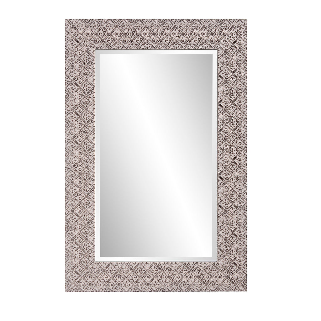 Add some chic charm to your home with the beautiful Gray Embossed Faux Wood Rectangular Mirror. This stylish beveled mirror features a crystal clear reflection and a unique embossed texture radiating that chic vibe. The exquisite embossed pattern makes it an eye-catching accent piece for any room, hallway, or entryway. 35" x 23" x 1"
