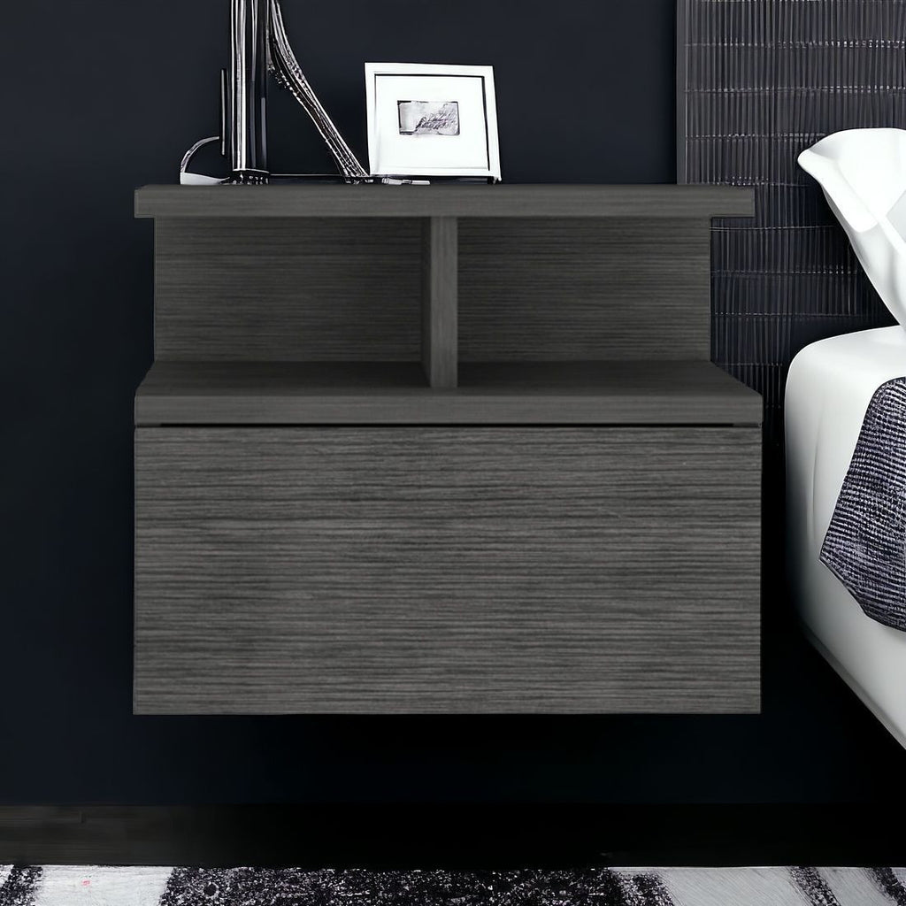 Good looking design and practical styling meet to form this 13-inch dark gray one drawer faux wood floating nightstand. Sturdy and durable construction from manufactured wood ensures this trusty bedside table is built to last. Includes a drawer to help keep your essentials close by and hidden. 2 shelves are included for you to have additional storage and display space. The unsung hero of the bedroom, this nightstand is perfect for keeping a glass of water, lamp, alarm clock, jewelry, and more, close by and easily accessible. Nightstands are obviously great beside the bed but can be used just as easily to help battle clutter in your living room, hallway, office, or dining room. 13-inch H x 14.01-inch W x 12-inch D