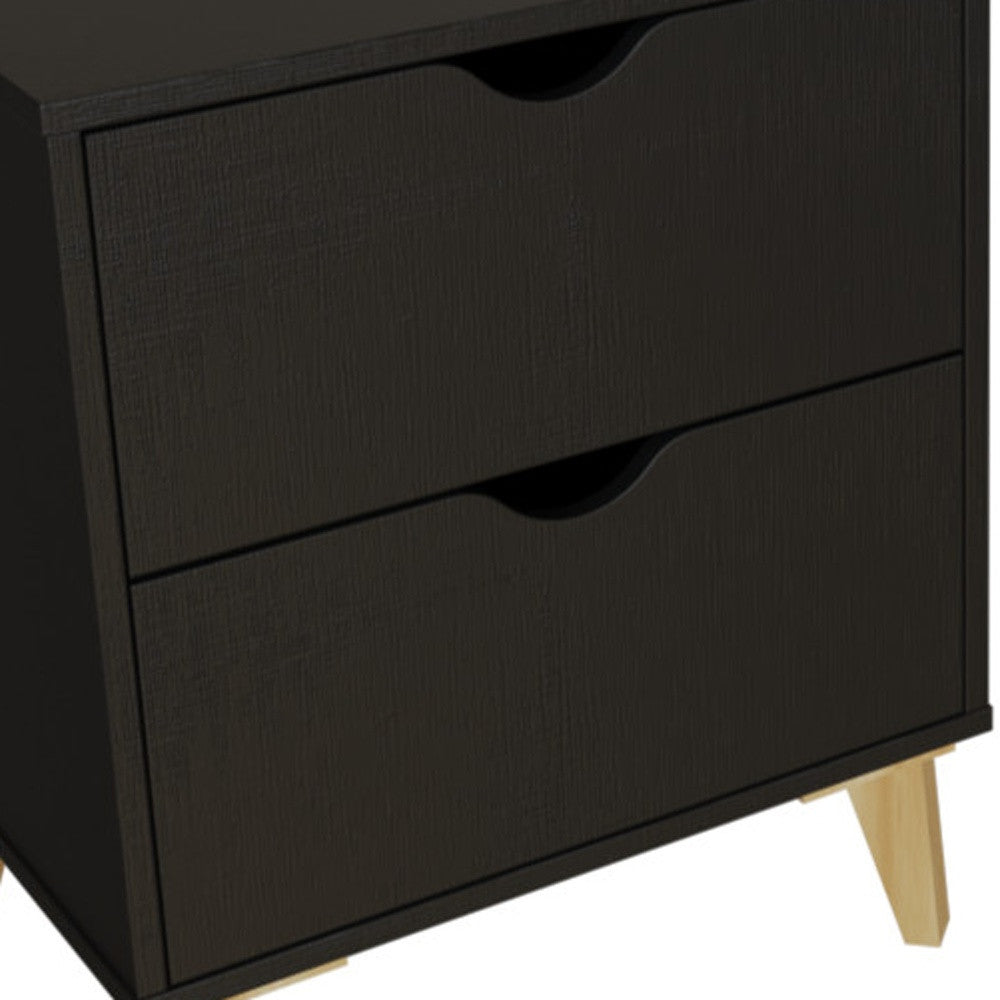 Our 24-inch black two drawer faux wood nightstand will compliment your bed beautifully. Made of high quality manufactured wood that is built to last. The piece has 2 drawers to store your bedtime essentials close to you as you rest. The design includes natural solid wood legs to give stability and finish off the look. The unsung hero of the bedroom, this nightstand is perfect for keeping a glass of water, lamp, alarm clock, jewelry, and more, close by and easily accessible. Look no further than this nightstand to accommodate all your needs and upgrade the style of your bedroom. 24-inch H x 20-inch W x 16-inch D