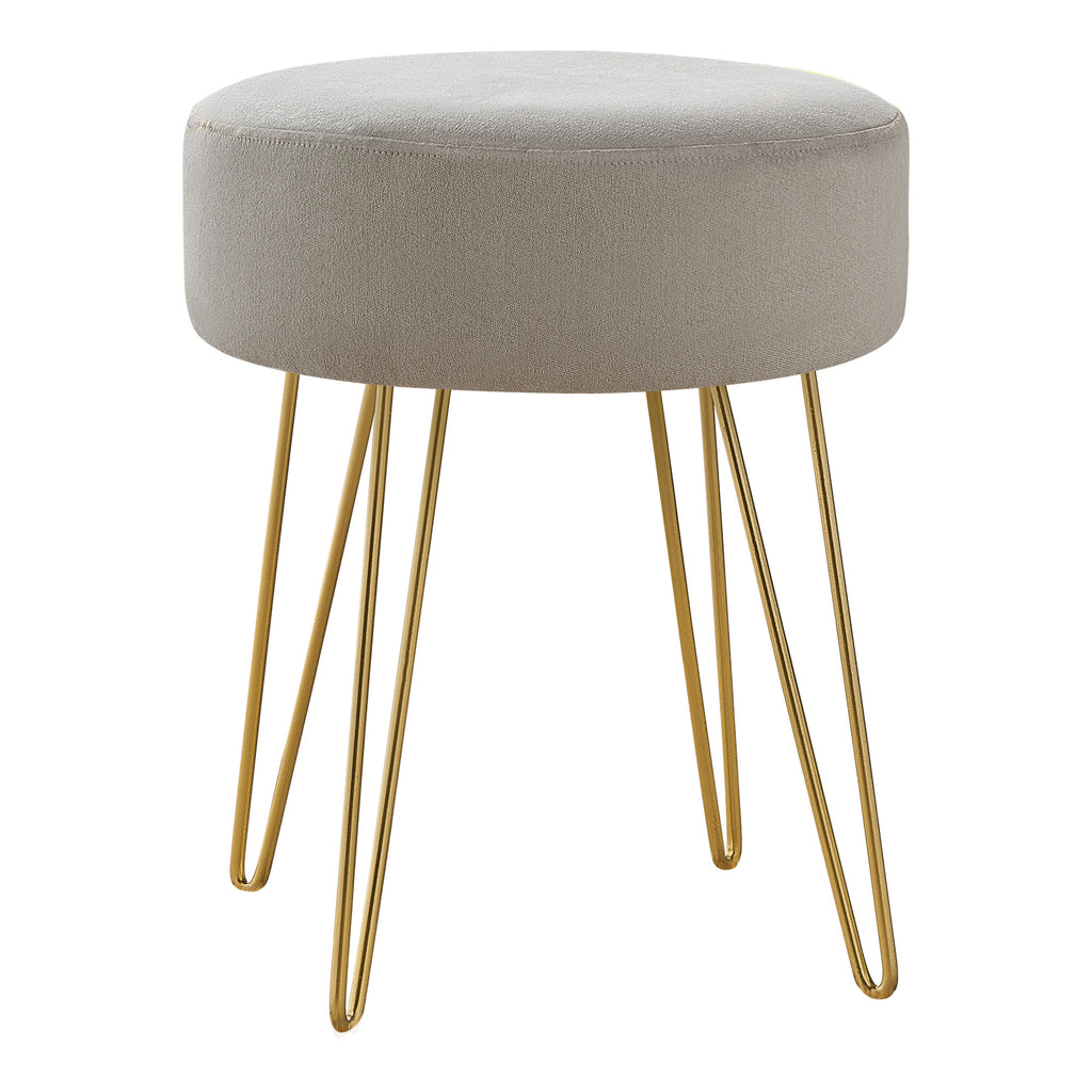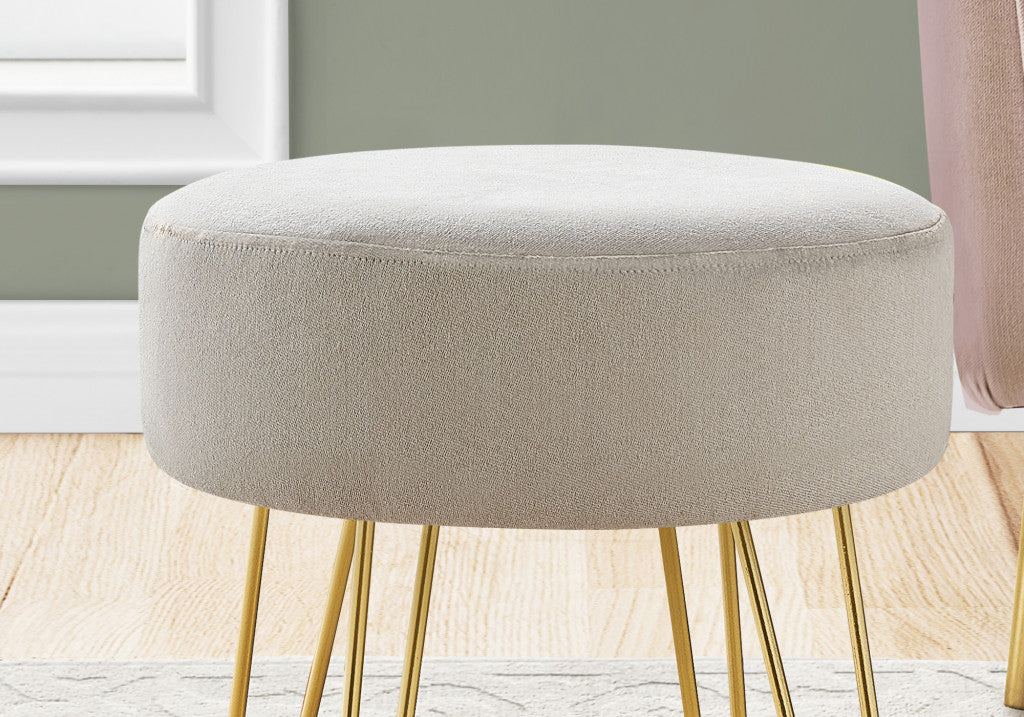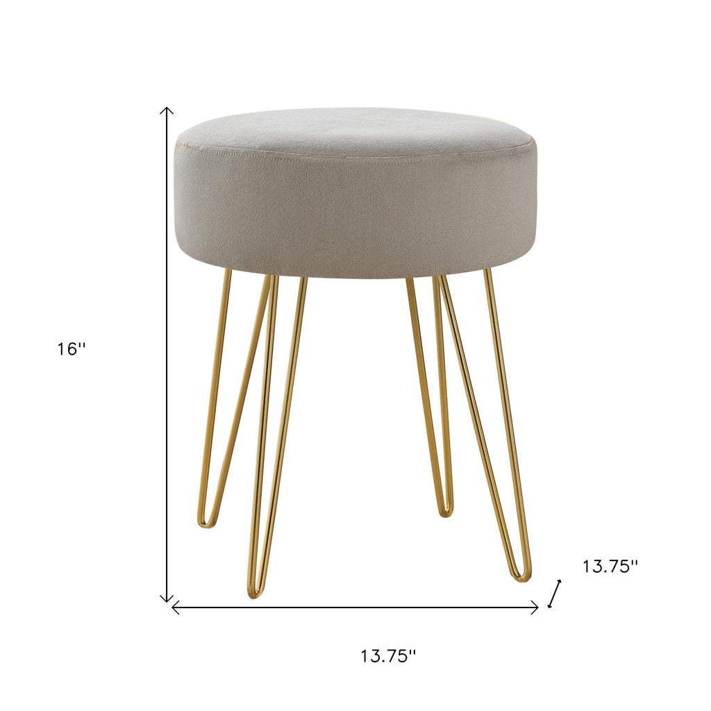 Get ready to relax with this 14" beige velvet and gold round ottoman. A gold metal frame is finished off with a beige upholstery seat that is the epitomy of quality construction and design. Expertly upholstered with padding in a soft solid color velvet, this ottoman is as comfortable as it is good looking. Ottomans are multi-functional additions to your space that add fashion and practical value. 16" H x 13.75" W x 13.75" D
