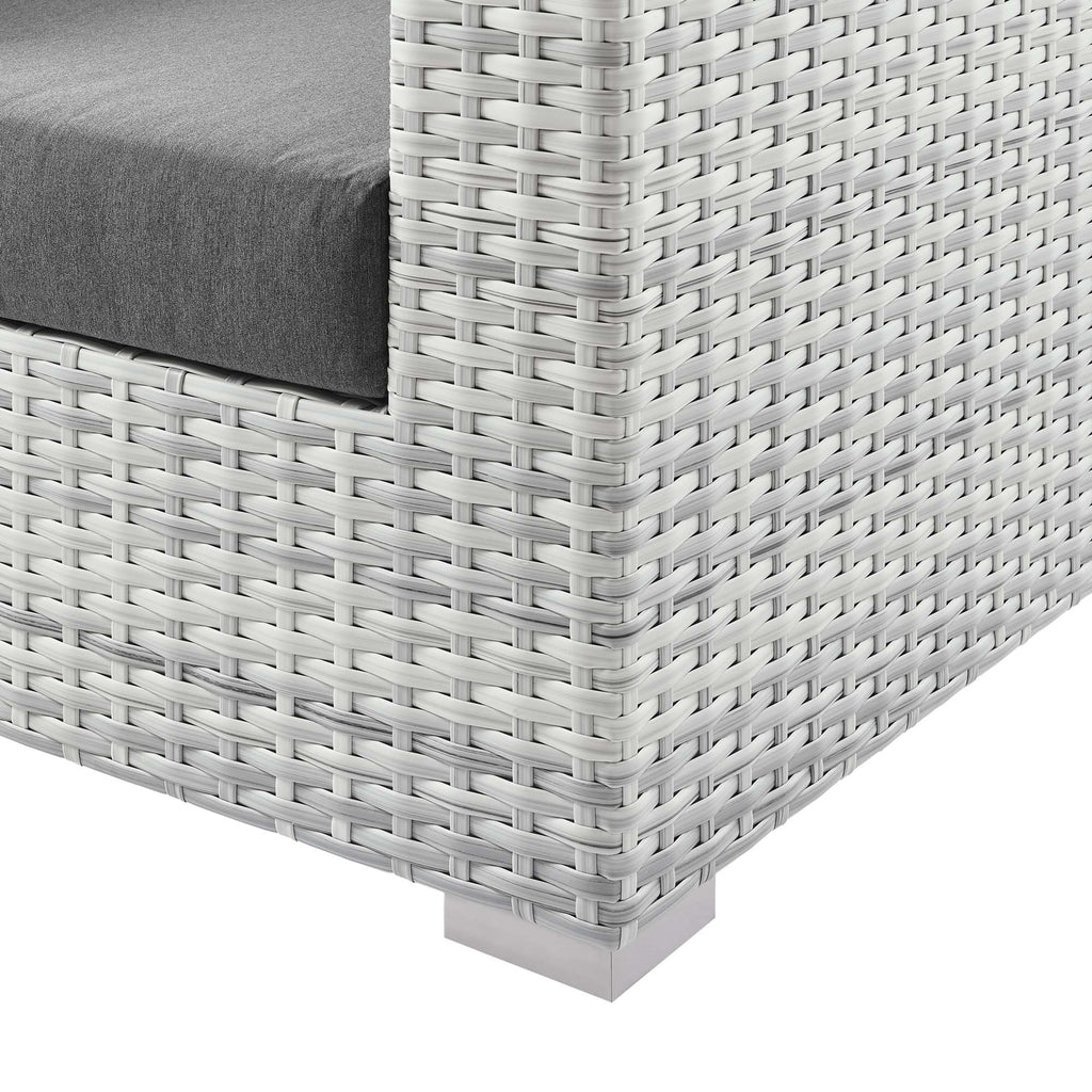 Gather stages of sensitivity with the Convene Outdoor Sectional series. Made with a synthetic rattan weave and a powder-coated aluminum frame, Convene is a versatile patio armchair from an outdoor collection that shifts and combines according to the spontaneous needs of the moment. Outfitted with all-weather fabric cushions, the Convene Armchair leaves a positive impression on friends and family while enhancing your patio, backyard, or poolside retreat with palpable distinction. Set Includes: One - Convene Armchair