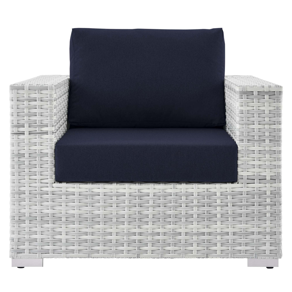 Gather stages of sensitivity with the Convene Outdoor Sectional series. Made with a synthetic rattan weave and a powder-coated aluminum frame, Convene is a versatile patio armchair from an outdoor collection that shifts and combines according to the spontaneous needs of the moment. Outfitted with all-weather fabric cushions, the Convene Armchair leaves a positive impression on friends and family while enhancing your patio, backyard, or poolside retreat with palpable distinction. Set Includes: One - Convene Armchair