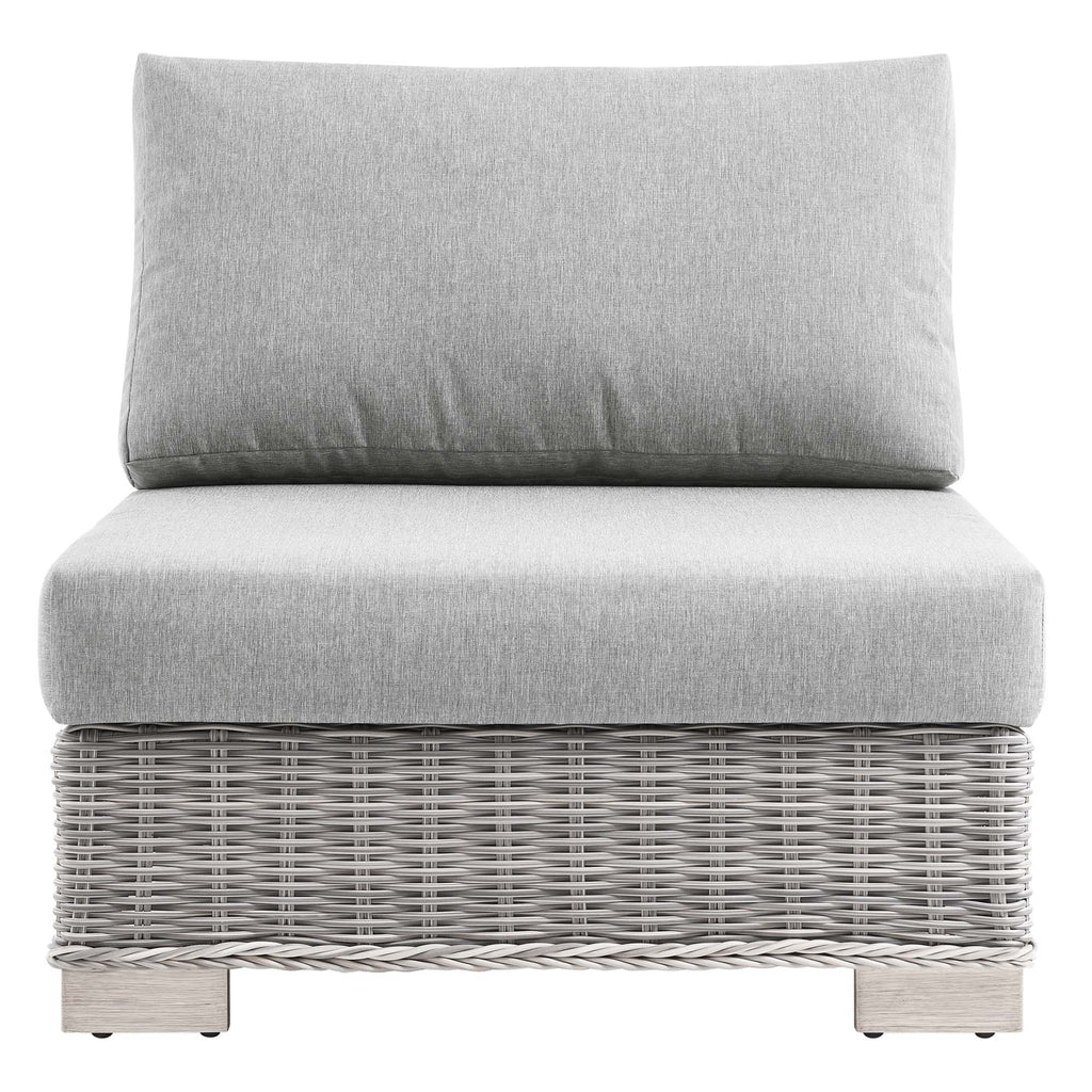 Enjoy fresh air and alfresco relaxation with the Conway Outdoor Patio Wicker Rattan Armless Chair. Wrapped in UV-resistant light gray synthetic wicker rattan, this patio chair boasts organic texture and a neutral hue that brings a calming presence to your outdoor space. The frame of this outdoor armless chair is crafted with durable powder-coated aluminum and rests on L-shaped legs with plastic foot glides. Thick foam padded cushions covered with removable, water-resistant polyester covers offer a comfortable seat and affix securely to the lounge chair with cord tension attachments. Trending aesthetics and a classic design define this outdoor patio furniture collection making it a beautiful addition to any outdoor space including the backyard, patio, porch, balcony, or poolside. Assembly required. Patio Armless Chair Weight Capacity: 300 lbs. Set Includes: One - Conway Armless Chair