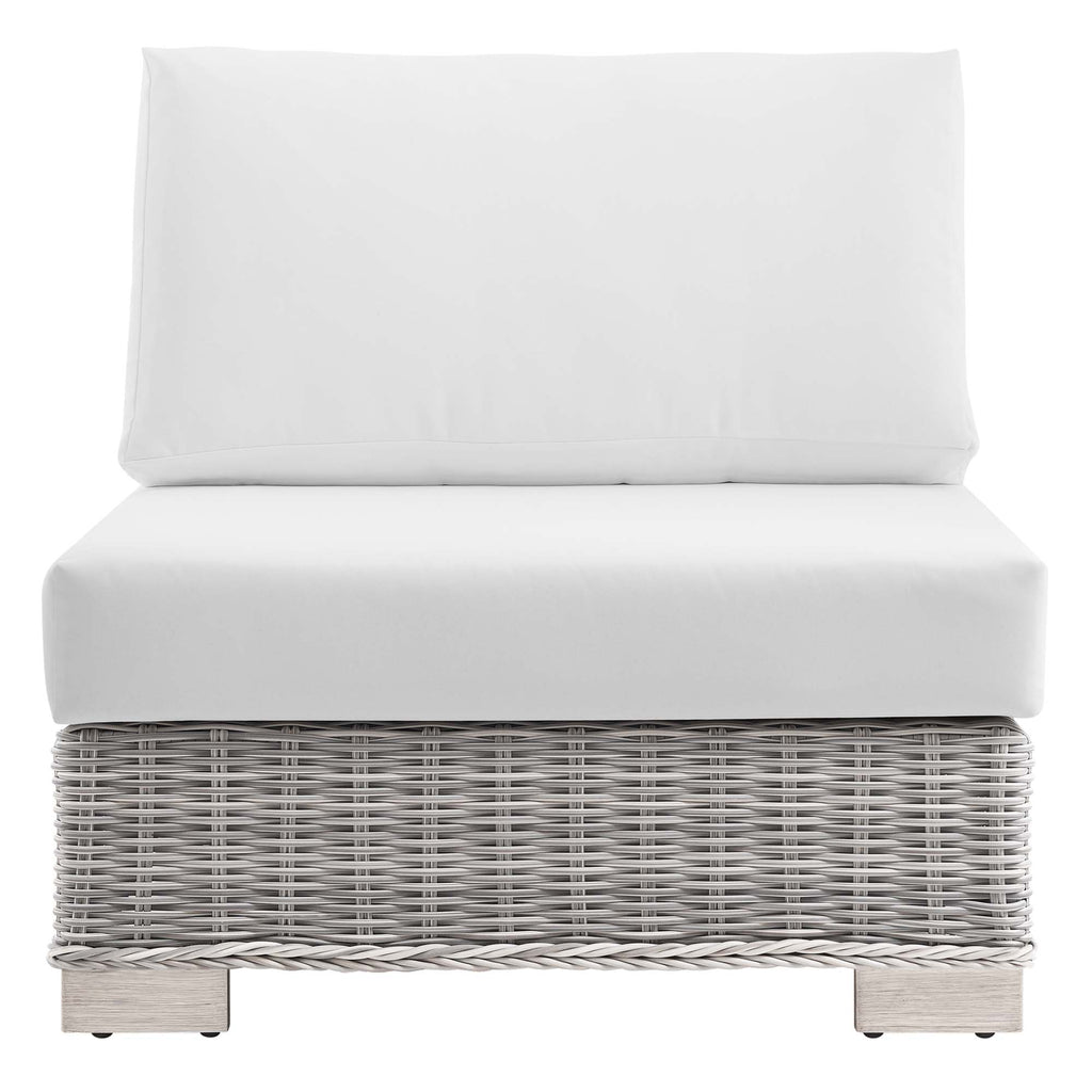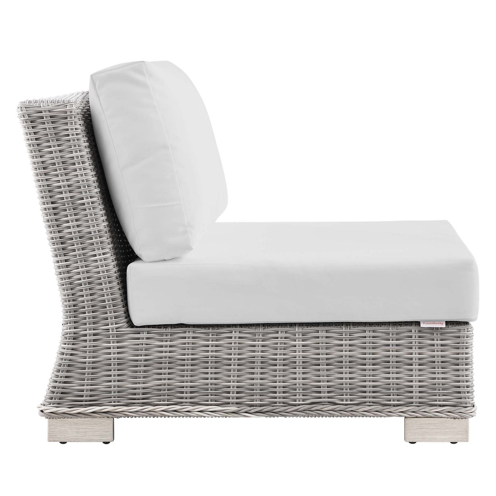 Enjoy fresh air and alfresco relaxation with the Conway Outdoor Patio Wicker Rattan Armless Chair. Wrapped in UV-resistant light gray synthetic wicker rattan, this patio chair boasts organic texture and a neutral hue that brings a calming presence to your outdoor space. The frame of this outdoor armless chair is crafted with durable powder-coated aluminum and rests on L-shaped legs with plastic foot glides. Thick foam padded cushions covered with removable, water-resistant polyester covers offer a comfortable seat and affix securely to the lounge chair with cord tension attachments. Trending aesthetics and a classic design define this outdoor patio furniture collection making it a beautiful addition to any outdoor space including the backyard, patio, porch, balcony, or poolside. Assembly required. Patio Armless Chair Weight Capacity: 300 lbs. Set Includes: One - Conway Armless Chair
