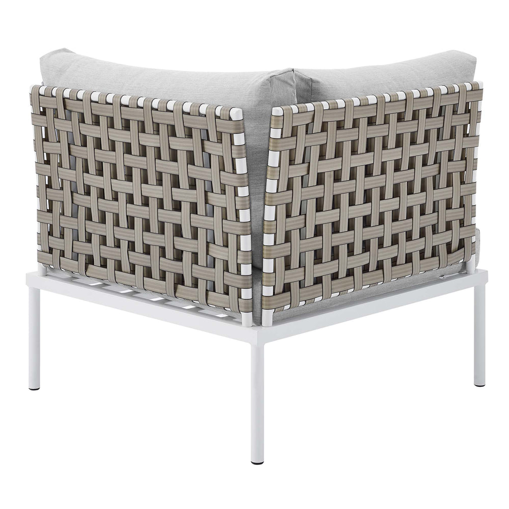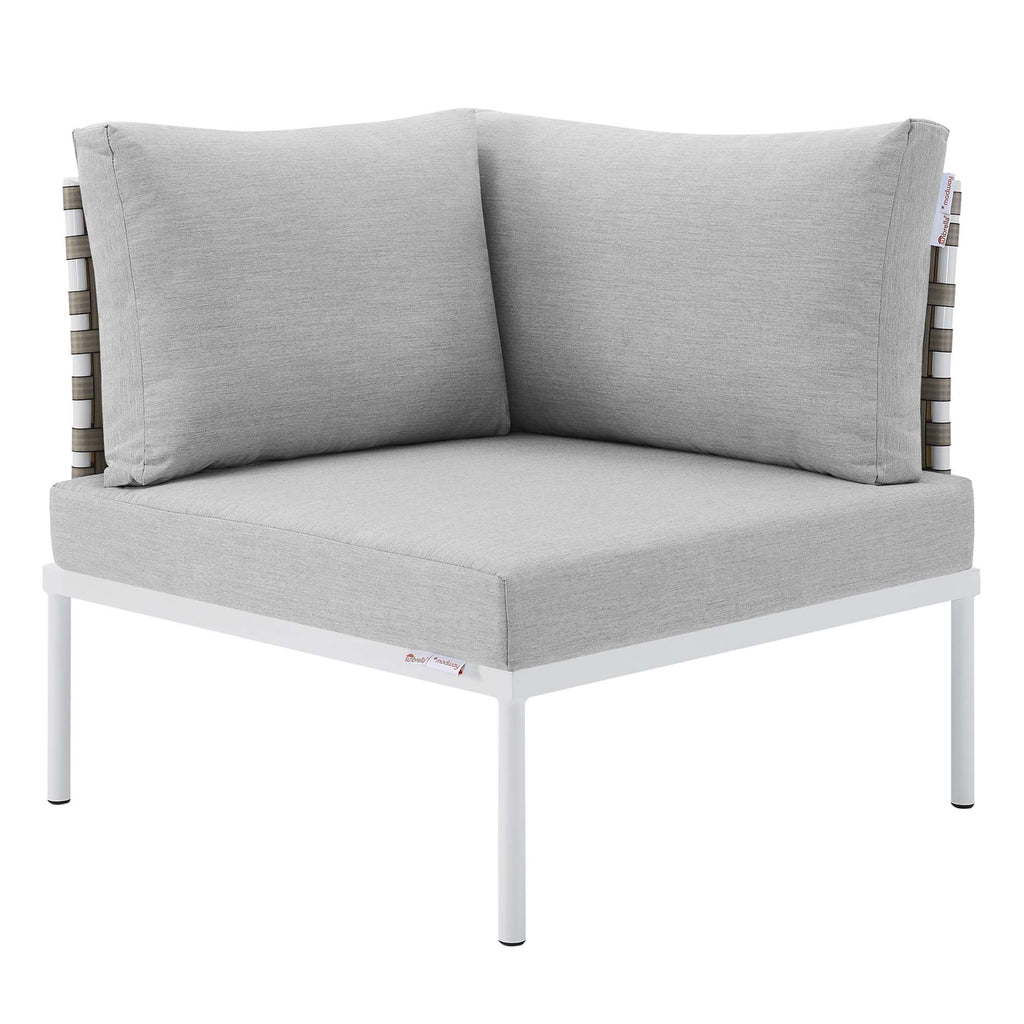 Engage life with Harmony Outdoor Patio Corner Chair. Enjoy casual conversation under the open sky with an all-weather waterproof outdoor sofa chair from a versatile furniture set that delivers an exceptional outdoor porch, patio, balcony or garden experience. An exceptional modern outdoor furniture set that exceeds expectations, Harmony Patio Corner Chair comes with synthetic rattan seat back weave, square powder coated aluminum bases, Sunbrella� cushions, and non-marking foot caps. An outside sectional corner chair that arranges according to the spontaneous needs of your guests, set your sights on open and inspired moments with the Harmony Outdoor Patio Collection. Set Includes: One - Harmony Basket Weave Corner Chair
