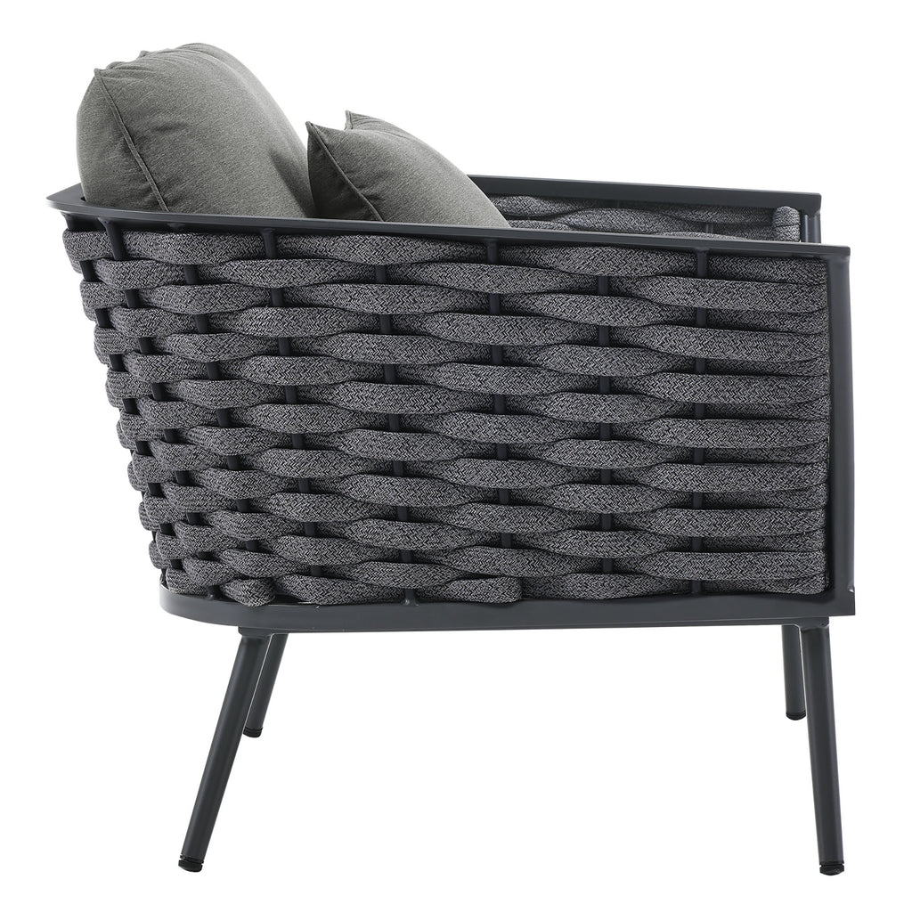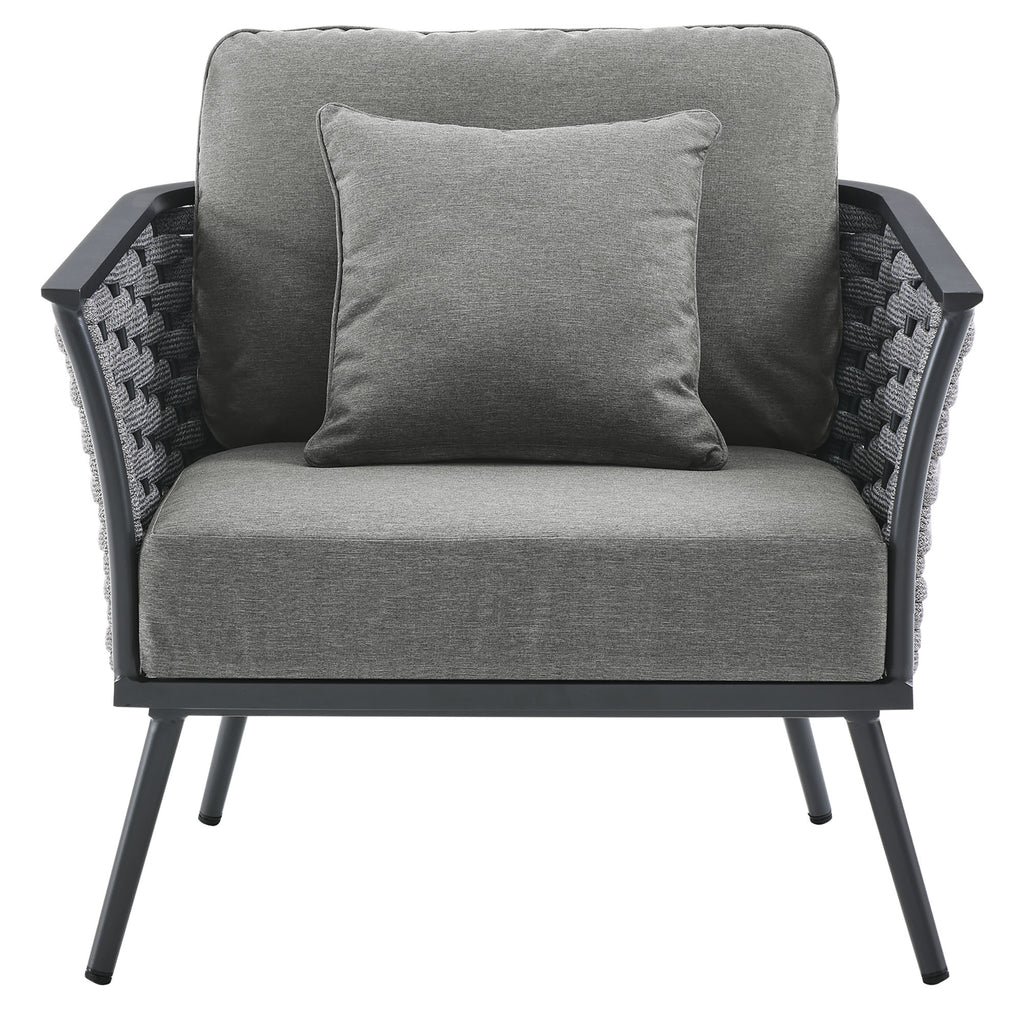 Gather family and friends for pleasant weather and good conversation with the Stance Outdoor Patio Furniture Collection. Boasting a contemporary modern look, Stance Outdoor Patio Arm Chair features woven polyester fabric rope seat back and flared powder-coated aluminum frame, while waterproof all-weather fabric cushions with dense foam padding provide a relaxing spot to lounge. A versatile patio arm chair designed for long-lasting durability, each piece in the Stance Outdoor Patio Collection can be mixed and matched and effortlessly arranged to fit the spontaneous needs of you and your guests. Chair Weight Capacity: 331 lbs. Set Includes: One - Stance Dining Armchair