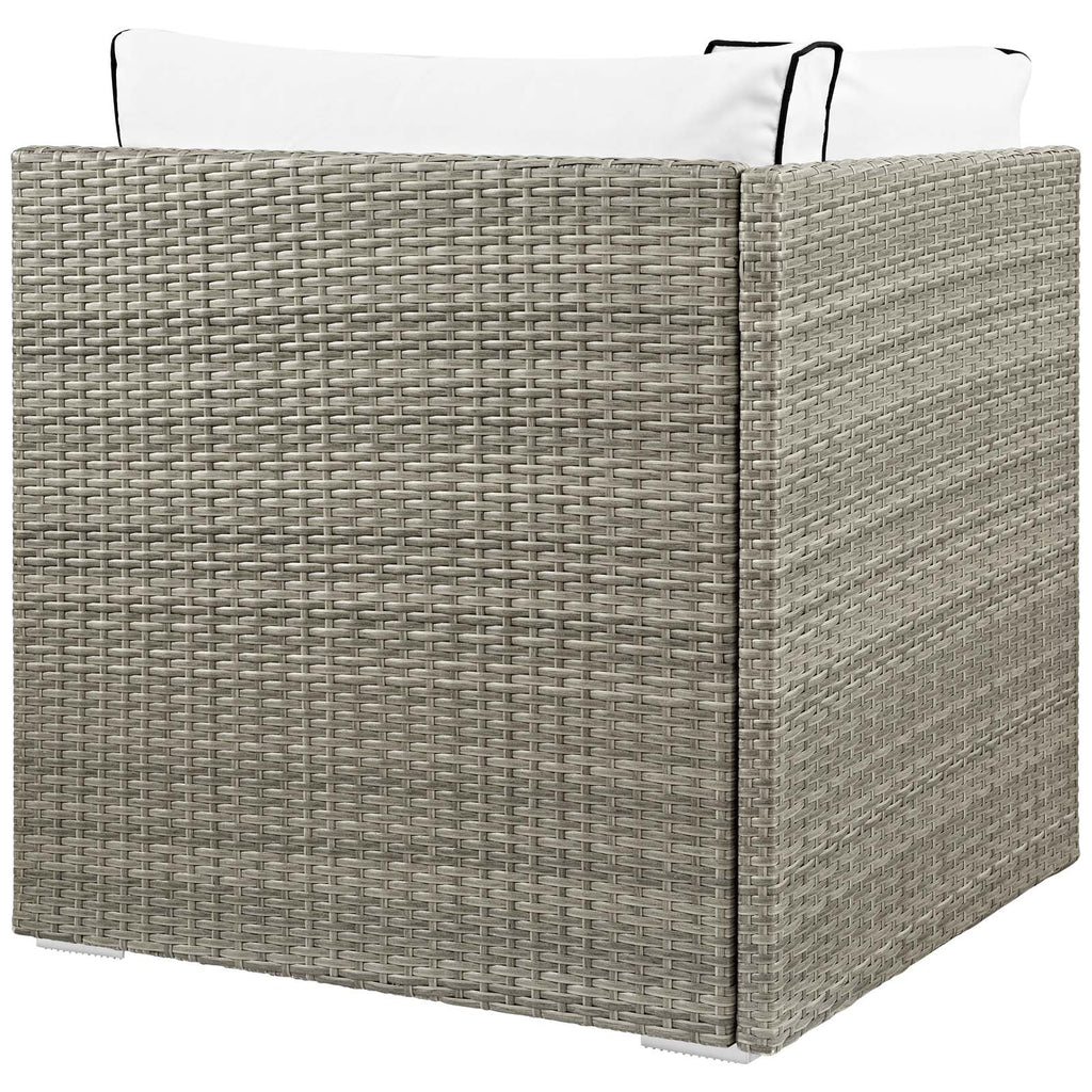 Enjoy the outdoors while benefiting from style and comfort of the Repose Outdoor Patio Furniture Series. Repose Patio Corner Sofa Chair offers a detailed tan and gray synthetic rattan weave with UV protection for eye-catching appeal and durability, plush 4� thick all-weather polyester cushions with contrasting color French piping, non-marking foot pads, and a sturdy powder-coated aluminum frame that supports up to 331 pounds. Subtle style defines the Repose outdoor sectional collection making it a natural choice for enhancing your patio, backyard, or poolside gatherings. This installment of the series is a patio corner sofa chair. Set Includes: One - Repose Corner