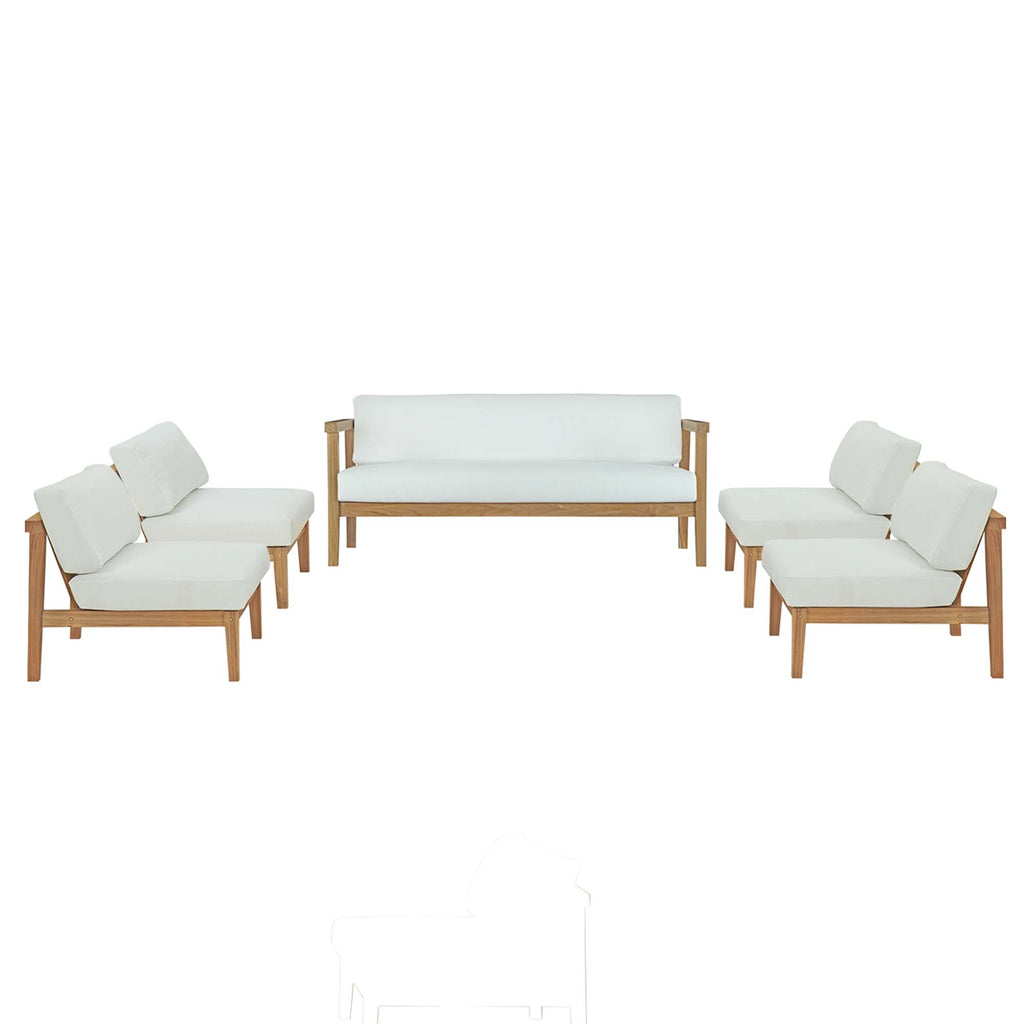 Savor leisure moments with the Bayport Teak Outdoor Collection. Become inspired by morning breezes and sunny afternoons with a series featuring configurations to accommodate any space. Made of solid teak wood with all-weather machine washable white cushions, Bayport comes designed with slanted backs and a variety of leisure seating selections. Known for its ability to withstand extreme weather conditions, teak is the wood selection of choice for long-lasting outdoor furnishings. Assembly required. Set Includes: Four - Bayport Armless Chair One - Bayport Loveseat